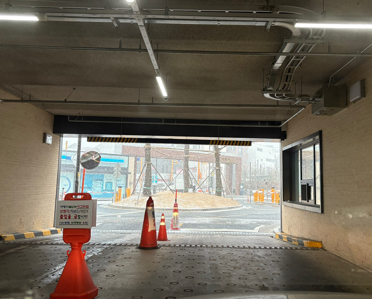 주차장에 들어서니 바퀴사이 낀 눈으로 바닥이 미끄러웠다.