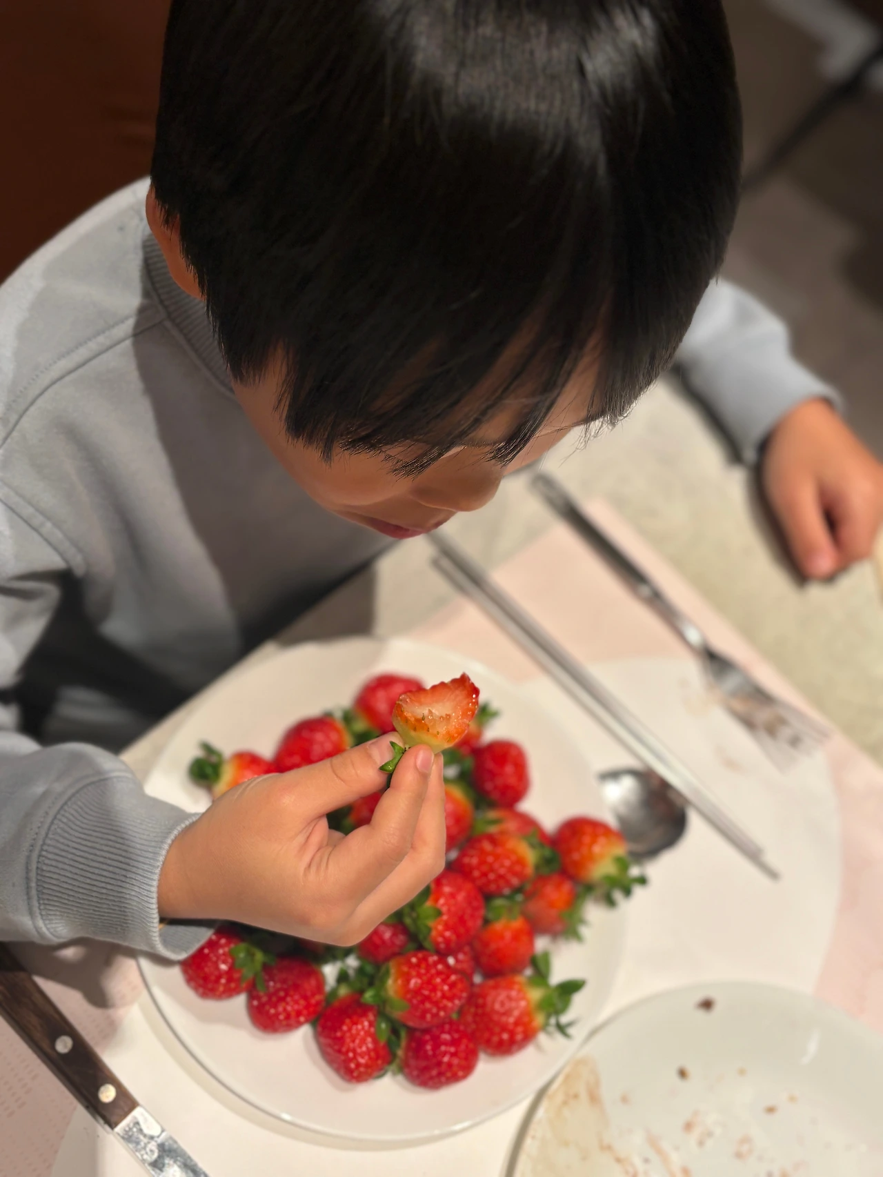 둘째는 접시 한가득 딸기를 담아와서 흡입하기 시작했다.