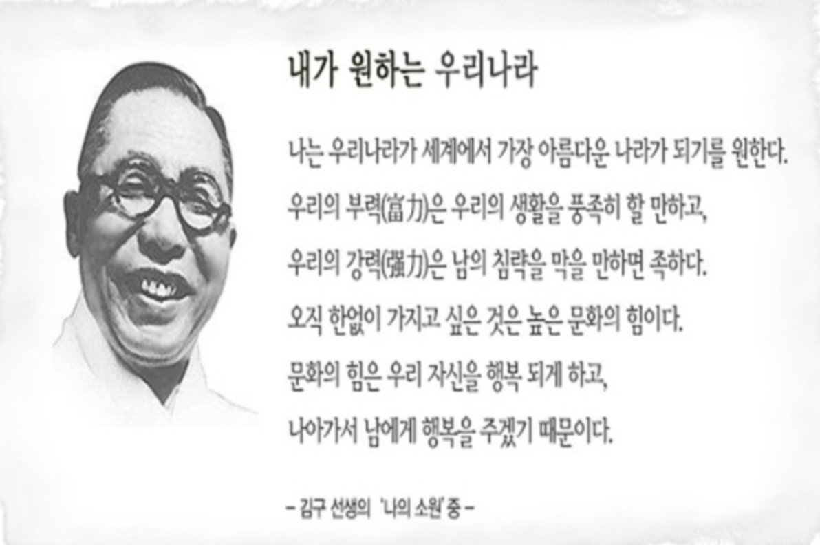 백범 김구 선생님은 위와 같은 말씀을 남기셨다고 한다. 나는 현재 한국의 문화가 나누어주고 있는 행복을 만끽하고 있는 사람들 중 한 사람이다. 김구 선생님의 말씀대로 앞으로도 계속 한국이 더 큰 문화강국으로 발전해 전 세계의 더 많은 이들을 행복하게 해 주기를 진심으로 응원한다.
