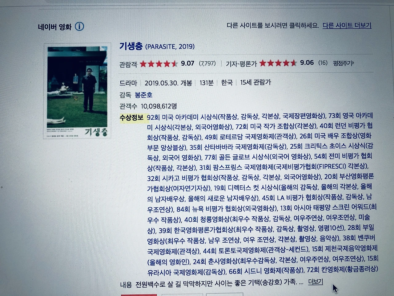 기생충의 전 세계 영화 시상식의 트로피 모으기 놀이는 비현실적인 경이로운 기쁨과 함께 알 수 없는 통쾌함을 주기도 한다. 특히 해외에서 생활을 하다 보면 불쑥불쑥 인종차별을 당하기도 하고 은근히 백인들의 우월 주위를 느낄 때도 있는데 기생충이란 영화가 저렇게 전 세계의 혹은 백인들의 잔치라는 몇몇 영화 시상식들에서 마저 최고의 자리에 오르는 것 보면 참 만감이 교차한다. 이런 날이 오는 것을 내 눈으로 보게 되는 날이 오게 됐다니.. 감동적이고 감사하다. 해외에서 생활하면서 이방인으로써 텃새가 무엇인지 알기에 그 들만의 리그에 들어가는 게 얼마나 힘든 일인지 알기에 그리고 그들이 얼마나 힘든 일들을 보란 듯이 잘 해내고 있는지 알기에.