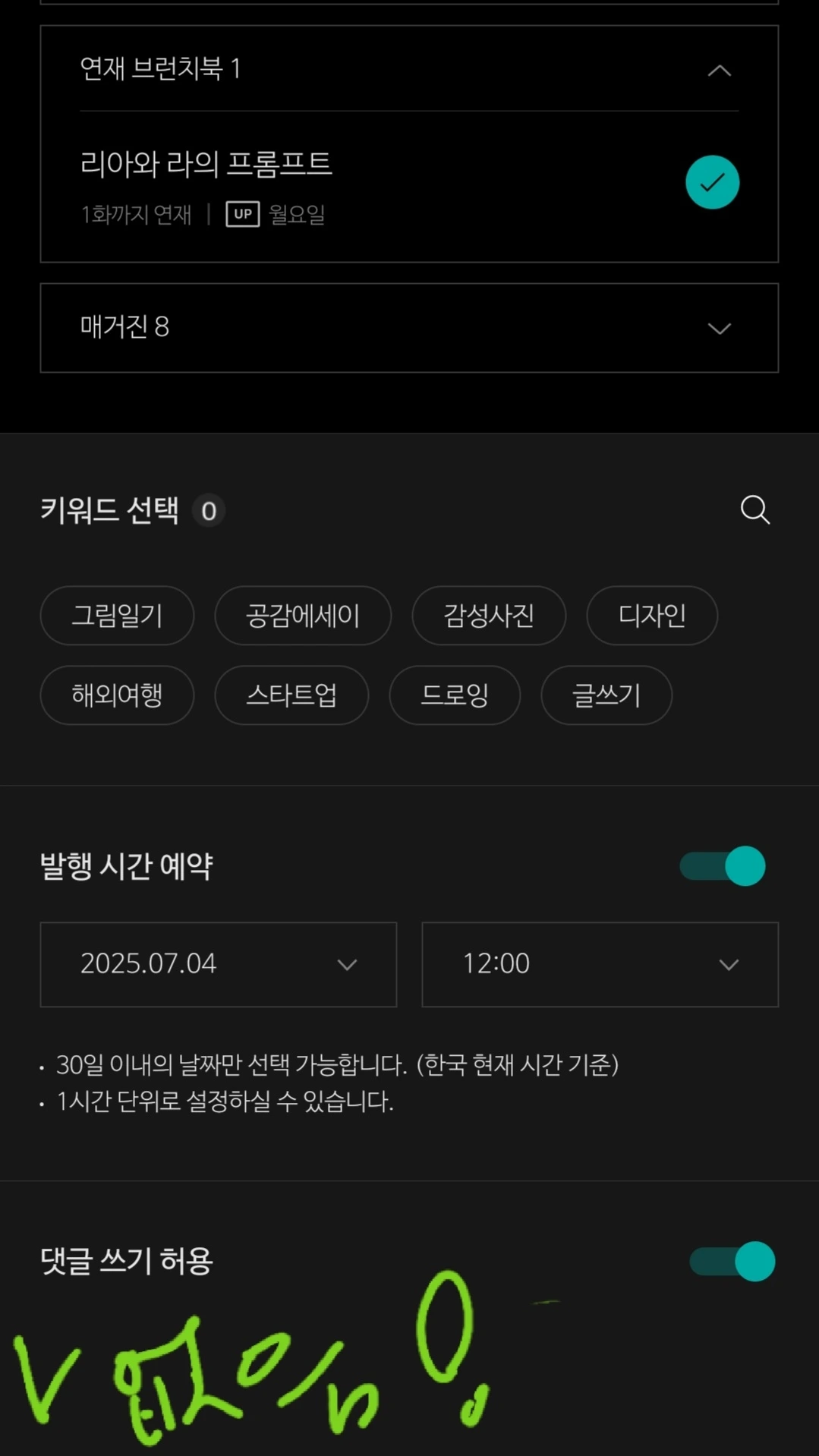 내가 글 발행 시에는 위 '멤버십 콘텐츠 설정'이 나타나지 않고 있다!