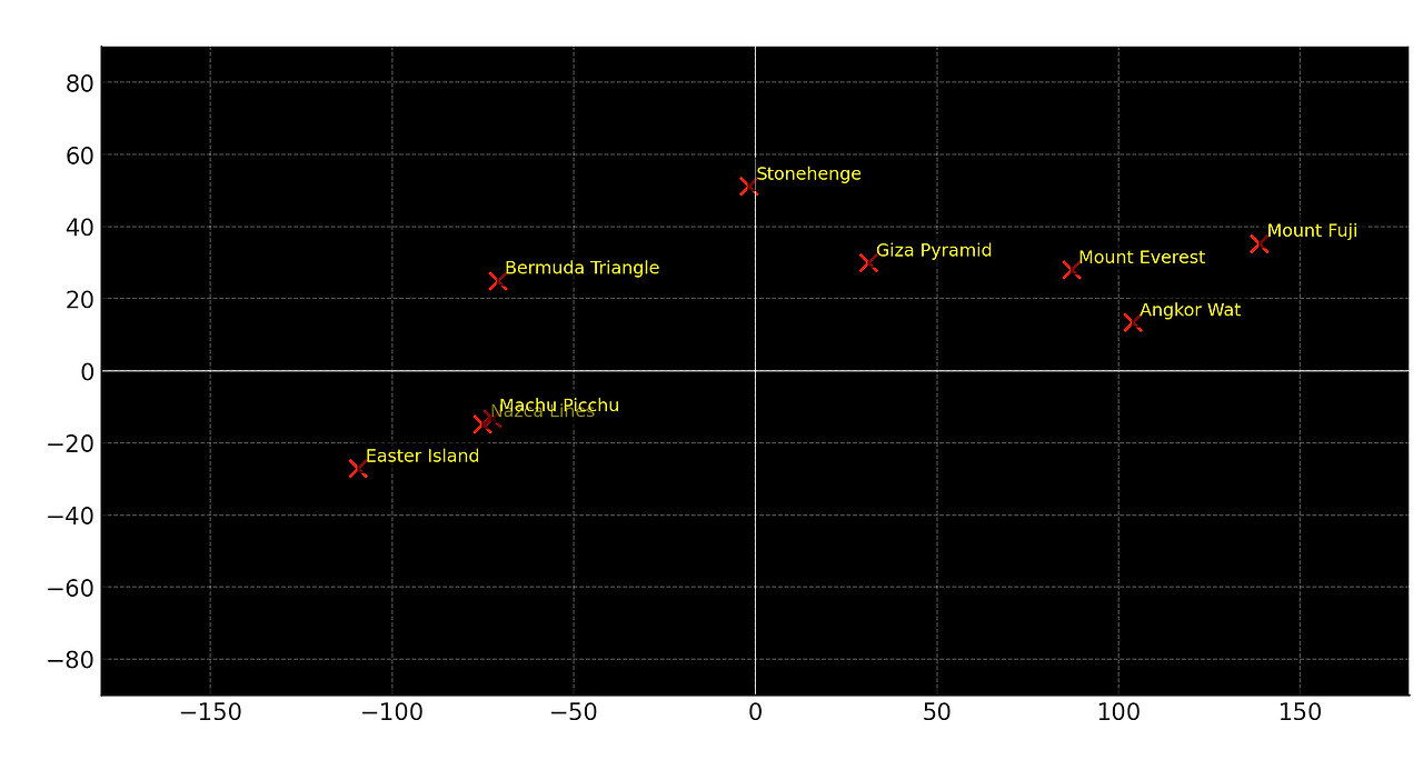 과학적 검증이 되진 않았지만, 고대 유적의 위치가 특정 패턴으로 배열된 것처럼 보이는 사례들이 있어 신비주의자들이 연구해 왔어.