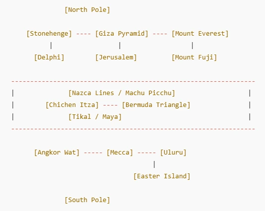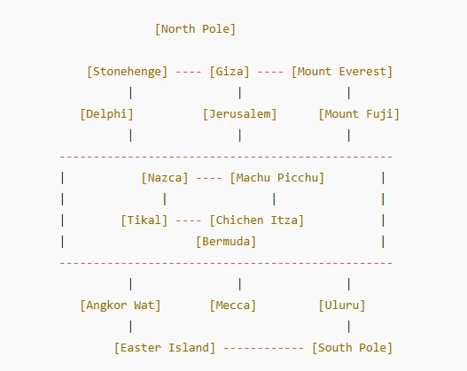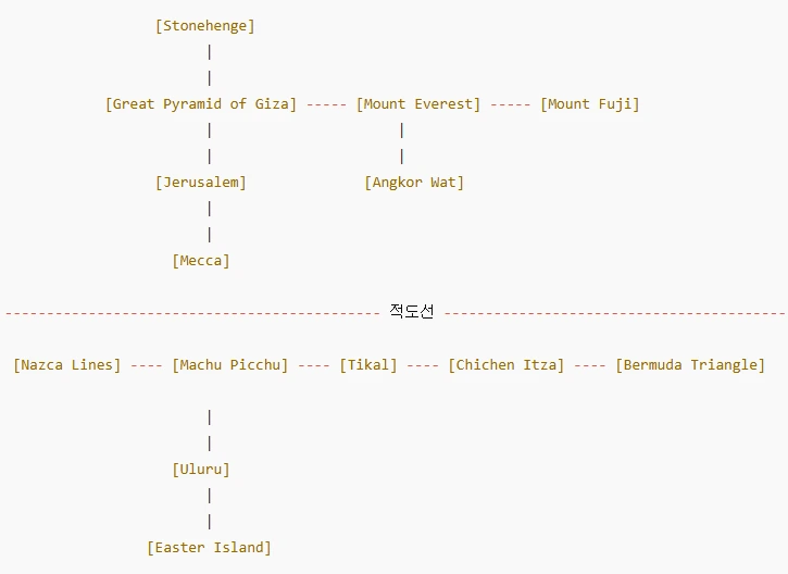 이 격자 위에 전 세계 성지와 고대 건축물이 올라와 있다고 주장됨.
