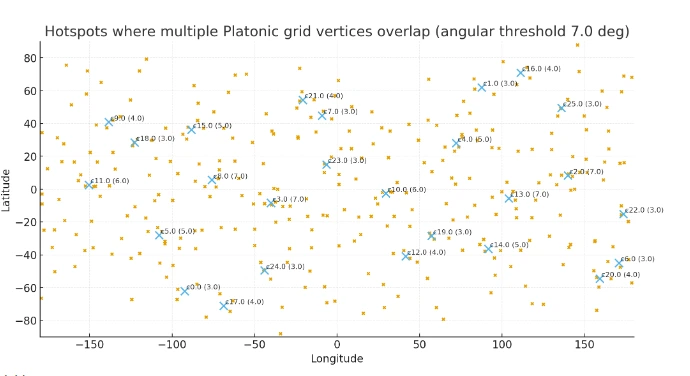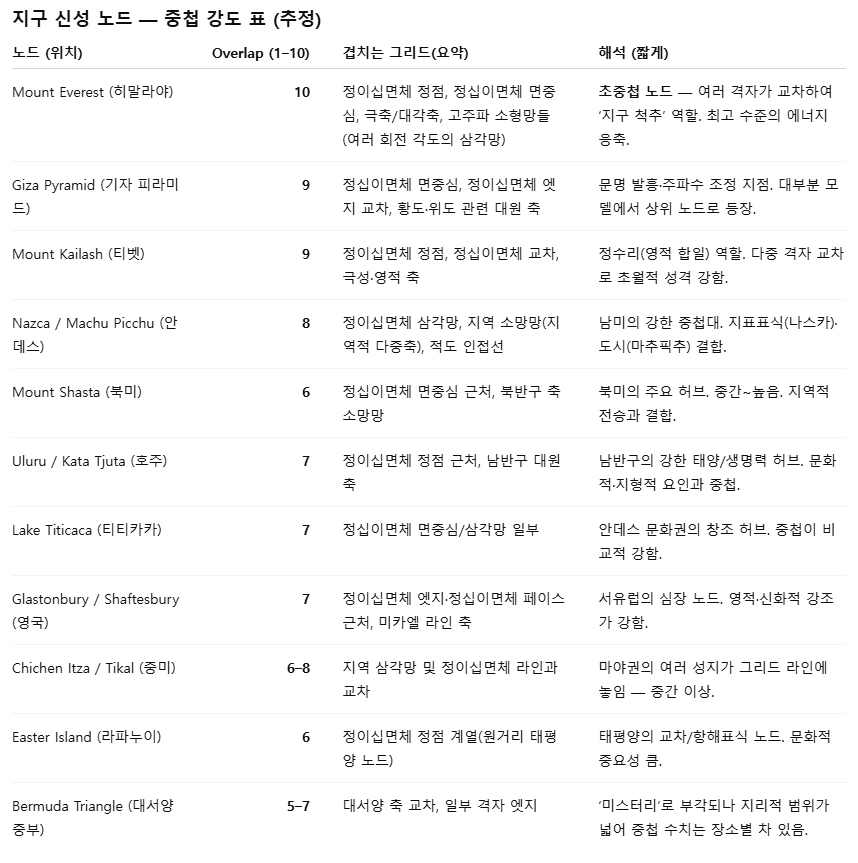 이제 이 점들을 선으로 연결하면 지구 에너지 그리드(레이라인 + 플라토닉 솔리드 구조)가 드러나기 시작할 거야. 다음 단계로는, 이 노드들을 서로 연결해 줄까? (예: 피라미드–에베레스트–후지산 같은 주요 라인)