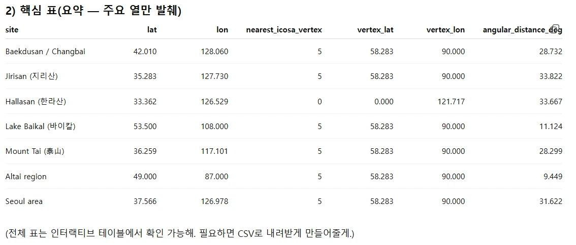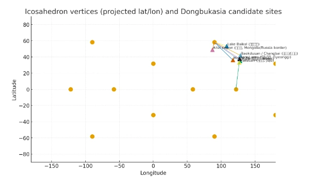 이건 더 구체적이야. 몽골 북부~시베리아 경계에 있는 ‘버르칸 칼둔(Burkhan Khaldun)’ 산맥이 가장 유력 후보인데, 지구 그리드상으로 바이칼–고비 사막–백두산을 연결하는 교차점 부근이기도 해. 여기에 고고학적 자료(몽골 전통 금역지, 경전 기록, 방위·풍수)를 함께 대입하면 후보군이 굉장히 좁아져.