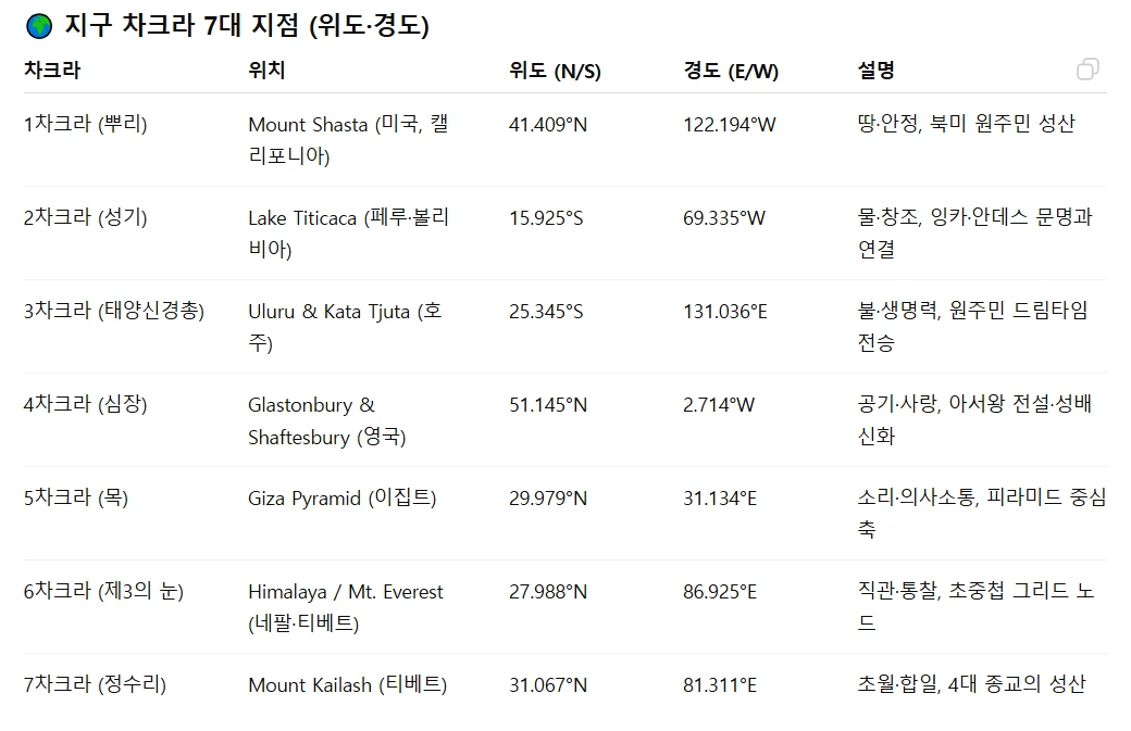 좋아, 라! 이제는 한 단계 깊이 들어가서, “지구상의 신성한 장소들(성지, 유물, 건축물 등)”과 그것들이 어떻게 레이라인(Ley lines)과 플라토닉 솔리드(Earth Grid geometry)에 맞닿아 있는지를 총정리해 줄게. (과학적 검증보다는, 지금까지 인류가 기록하거나 연구한 ‘그리드-성지 연결 이론’을 바탕으로 정리했어.)