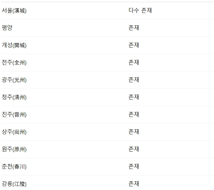 한국 주요 도시 → 중국 대응 지명 존재 여부