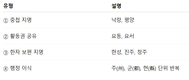 - 중국 행정군 명칭이 한반도 지명과 중첩되어 기록됨