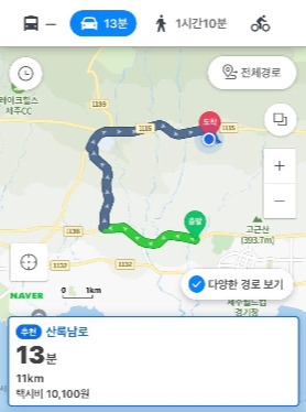 지도에는 보이지도 않는 도착지점에서 출발점까지 아래로 난 좁은 길 어디를 다녀왔습니다. 지도에 나오지는 않더라도 직선으로 내려가는 편이 더 빠를 거라고 생각했었죠.