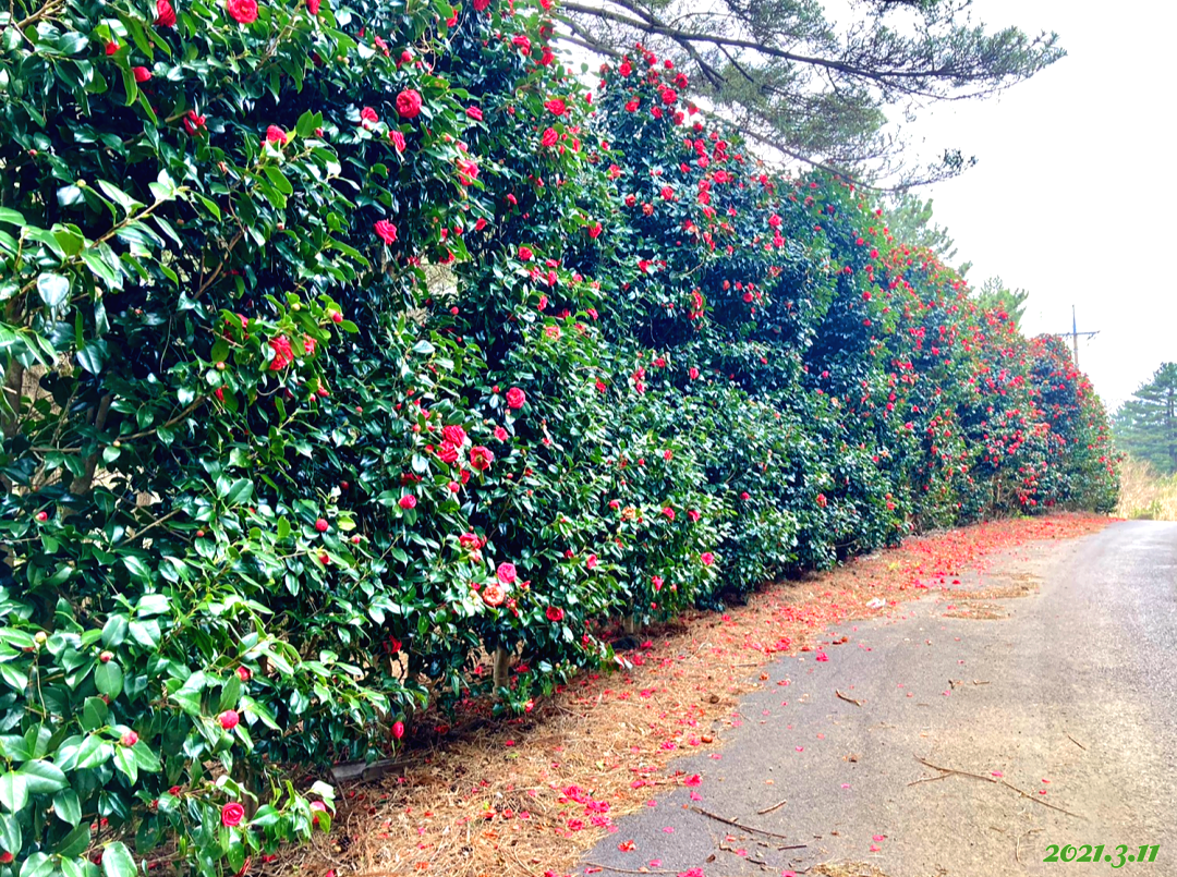 제주도 여행에서 가장 인상적인 하루는 좁은 길에서 펼쳐졌습니다. 3월의 푸르름이 너무 예뻤기에 편의점까지는 아니라도 조금 더 걷기로 했죠. 그러자 꽃길이 나왔어요.