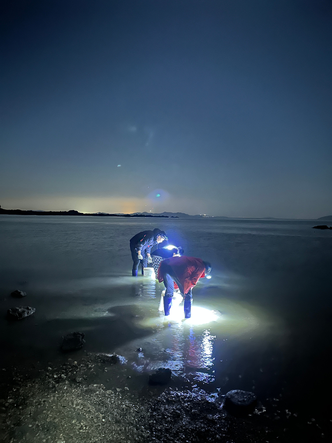 캄캄한 밤이 되고 난 뒤, 우리는 해루질을 나갈 준비를 하고 펜션 사장님을 따라 소라를 주우러 갈 수 있는 곳으로 차를 타고 나갔다. 밤에 소라 줍기의 핵심은 랜턴착용이다. 우리 가족도 하나에 3만 원하는 헤드랜턴을 4개 챙겨나갔지만 어림도 없다. 펜션 사장님의 10만 원짜리 해드 랜턴 정도는 되어야 돌인지 소라인지 어느정도 구분이 가능하다는 것을 당일에서야 알았다.