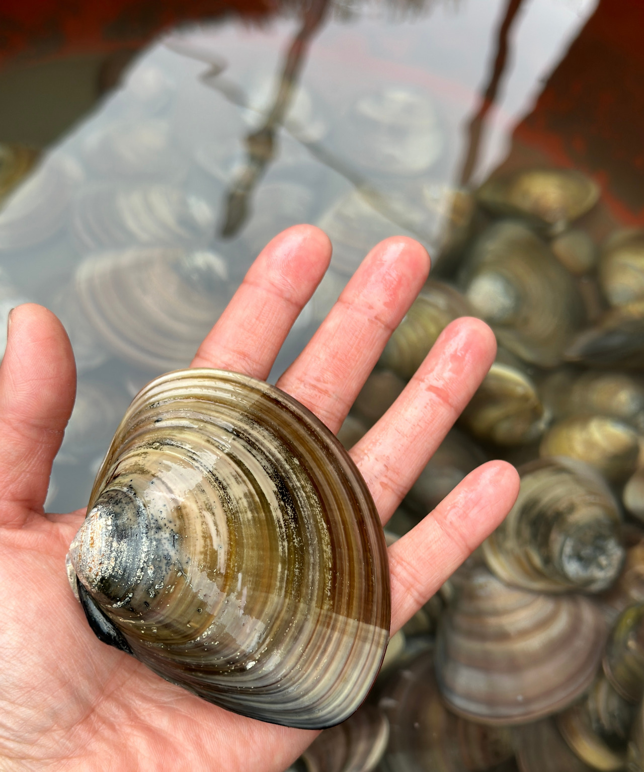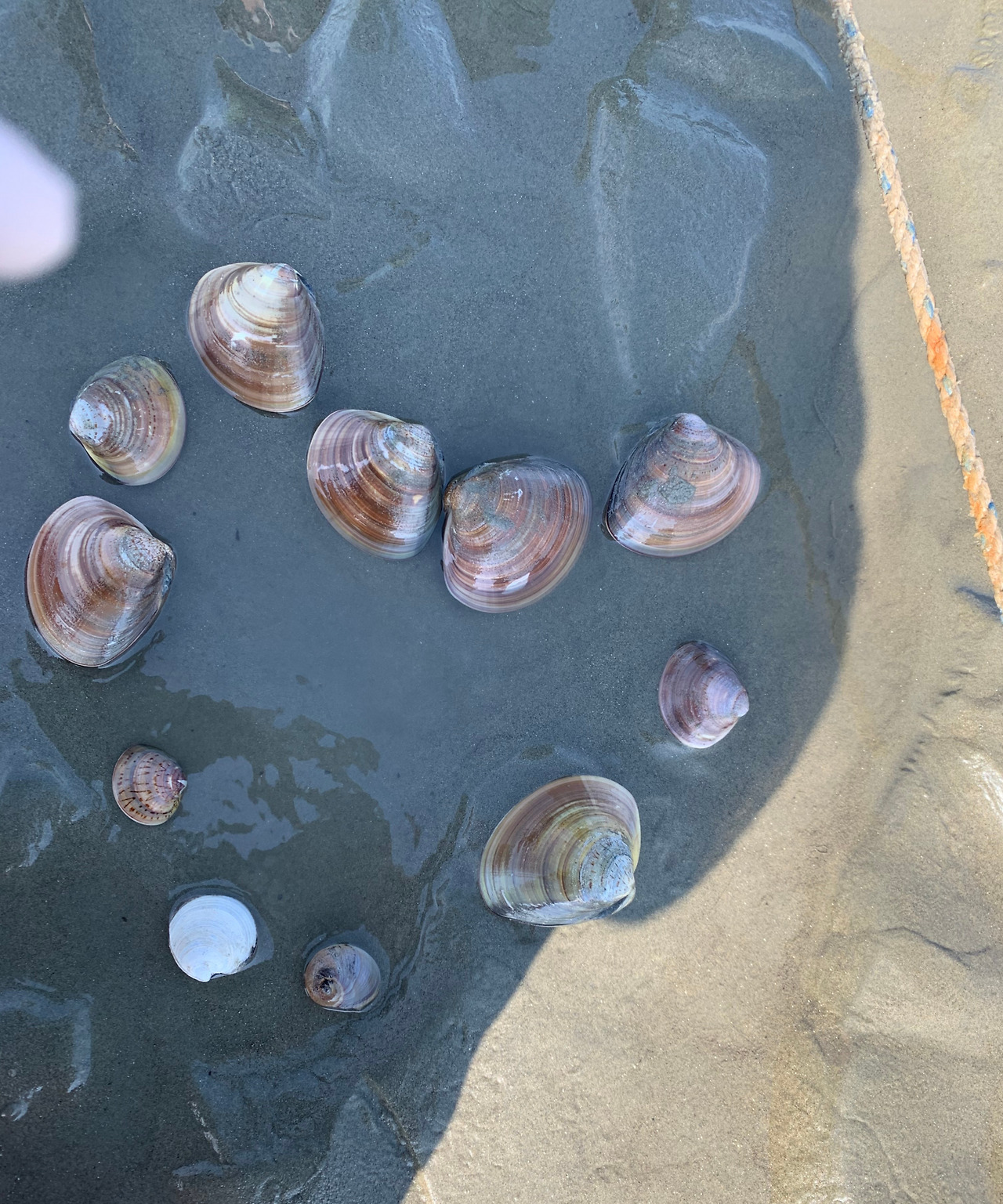 끝도 없는 갯벌을 한참 걷고, 또 걸어서 목적지에 도달했다. 마을 주민분들이 쳐놓은 그물은 피해서, 사장님이 말씀해 주신 곳에서 2인 1조로 한 명은 앞에서 그레를 끌고, 뒤에서 따라가는 다른 한 명은 '탁' 하고 조개 걸리는 소리가 나자마자 호미로 그 자리를 파서 커다랗고 묵직한 조개를 꺼냈다. 숙달된 사람들은 소리가 나자마자 그 느낌을 감지해 조개를 잡기가 수월하지만, 우리 같은 초보자들은 여러 번 그레를 끌어봐도 생각처럼 쉽지만은 않았다. 허리가 끊어질 듯 아프고, 힘이 들어도 두 시간이 넘도록 백합, 상합을 열심히 잡았다. 손바닥만큼 커다란 조개크기에 감탄을 연발하며, 저녁에 구워 먹으면 맛있겠다는 이야기도 더한다.