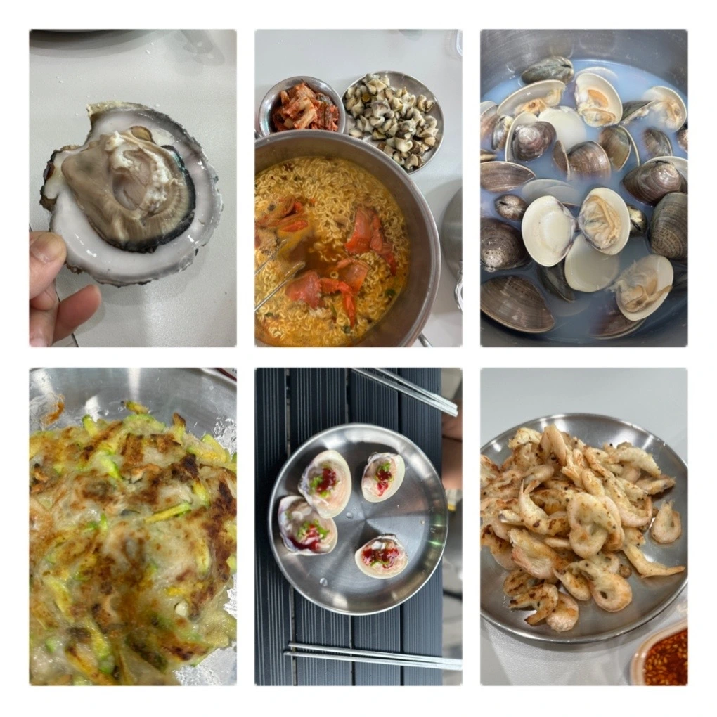 실로, 갓 잡아온 조개를 새빨간 초장에 찍어 조개회, 숯불에 노릇노릇 구워 조개구이, 팔팔 끓여 육수를 우려내 시원하고 얼큰한 칼국수, 새콤달콤 준비해 간 양념으로 무침회, 어머니표 반죽으로 해물부추전까지 해 먹었다. 먹다 보니 2박 3일 여행일정이 끝나가는 게 아쉽기만 했다.