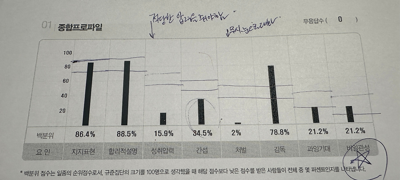 수업 전에 부모양육태도검사를 하는데, 나는 지지표현이나, 합리적 설명, 감독은 퍼센티지의 수치가 높아 지나침으로 나왔고, 성취압력, 간섭, 처벌은 미흡함으로 나왔다. 그리고 과잉기대나 비일관성은 이상적임이 나왔었다.