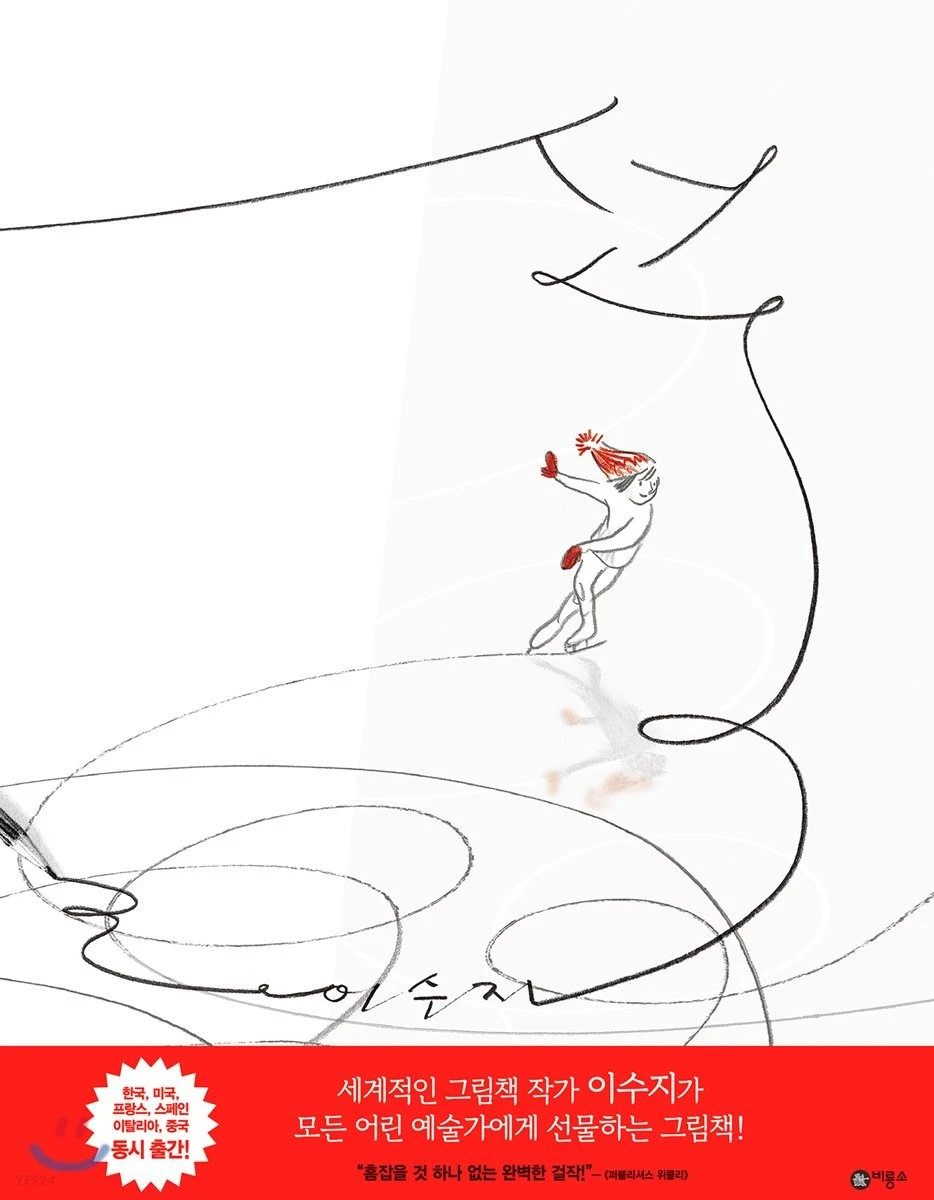 앞표지부터 뒤표지까지 눈을 뗄 수 없는 아름다운 연필의 선을 보여준다. 책의 앞면을 보면 제일 먼저 빨간 모자와 빨간 벙어리장갑을 쓴 아이가 보인다. 아이는 스케이트를 타고 있다. 스케이트를 타는 길을 따라 선이 생기고 있다. 그리고 그 길은 '선'이라는 글자를 만든다. '선'이라는 글자의 꼬리는 또 다른 선으로 이어지고 있다. 따라가면 '이수지'라는 작가의 이름이 보인다. 이름에 걸린 줄을 따라 눈을 돌리면 연필이 보인다. 그래서 표지를 넓게 펼쳐보다. 뒤표지가 보이며 비로소 연필이 완성된다. 그리고 연필보다 조금 위쪽에 지우개와 지우개로 지워진 선이 보인다. 선을 지우고 남은 지우개 가루가 보이고 지우면서 생긴 연필의 흔적이 어지러이 번져있다.