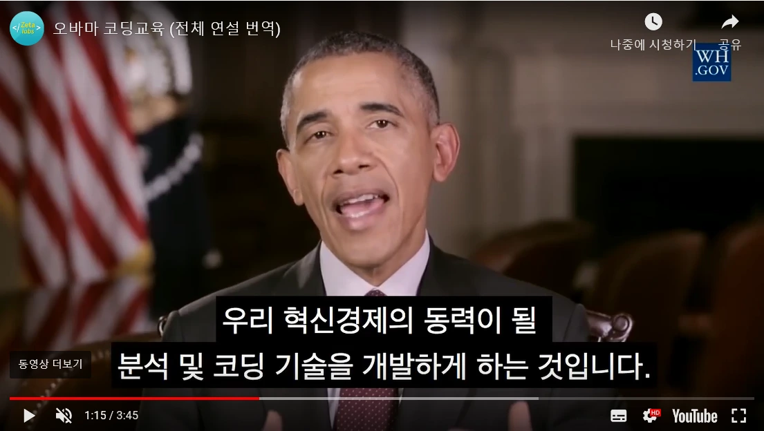 코딩 교육과 관련하여 오바마 전 미국 대통령의 연설을 보고 가는 것이 도움이 될 듯 하여 아래 링크를 걸었다.