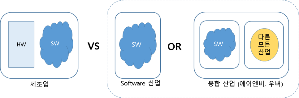 그리고 이젠 소프트웨어와 다른 업종과의 융합이 되는 시대이다. 예를 들어 에어앤비를 보면 소프트웨어로 홈페이지(어플리케이션이라 할 수 있는)를 만들어 개인들을 숙박업에 참여 시켰다. 그리고 택시도 기사도 없는 운수 플랫폼인 우버는 새로운 제품을 생산한 것이 아니라 새로운 시스템을 만들거나 변화시켜 성공한 케이스다. 하드웨어들의 성능 향상과 빨라진 인터넷 그리고 그 집약체인 스마트폰은 우리의 생활 방식을 바꿨고 위에서 언급한 플랫폼 외에 모든 사업에 소프트웨어를 적용해도 되는 세상이 되었다.
