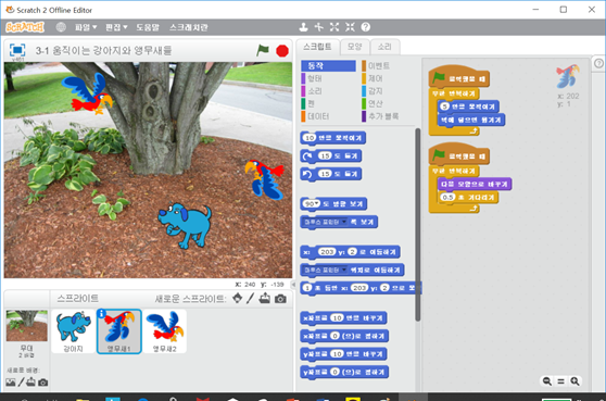 아래는 스크래치2의 화면이다. 사실 2019년 1월 (바로 얼마 전) 3.0으로 버전 업이 되었으나 일단 2.0 기준으로 보자면 전편에서 이야기한 것처럼 명령어를 레고를 쌓는 것처럼 블록으로 연결시켜 전체 동작을 시키는 블록형 프로그래밍 언어라 접근하기 쉬워 보인다.
