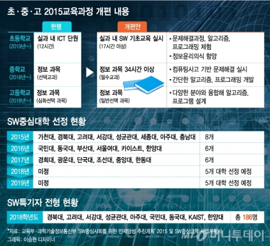 그래서 코딩이 정규 과목으로 된다고 한다. 그렇다면 SW교육을 제대로 할 수 있는 강사와 환경이 갖춰져 있고 공교육에서 학생들에게 기본 이상의 강의를 제공할 수 있는 여건이 되어 있을까? 그런데 벌써 SW 중심대학 선정과 SW특기자 전형을 한다는 기사를 쉽게 접할 수 있고 국가에서 밀어 부치려는 듯 보이고.. 교육적인 내용 외 다른 이유도 있지 않을까?