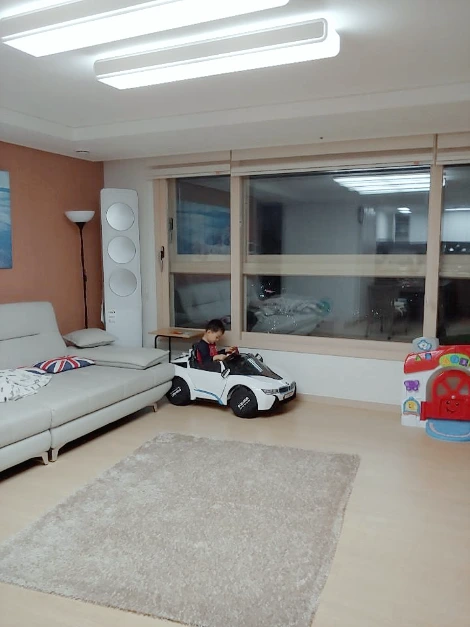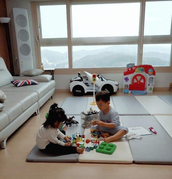 영어가 있는 (영어 책이 많이 진열되어 있는), 이벤트가 있을 때마다 아름답게 데코 되어 신나는 놀이터로서의 거실, 그리고 복잡하지 않은 심플한 나머지 공간의 활용을 통해 아이가 상상력을 펼칠 수 있는 장소를 제공하는.