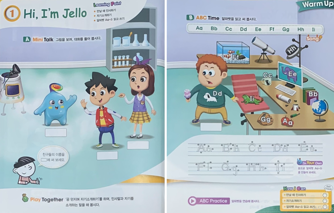 영어 첫 수업부터 문장을 사용하여 소통하는 연습을 해야 하고, 수백 번을 읽고 써봐도 b랑 d 가 헷갈리는 영어 알파벳은 1단원에서만 나오고 끝나버린다.