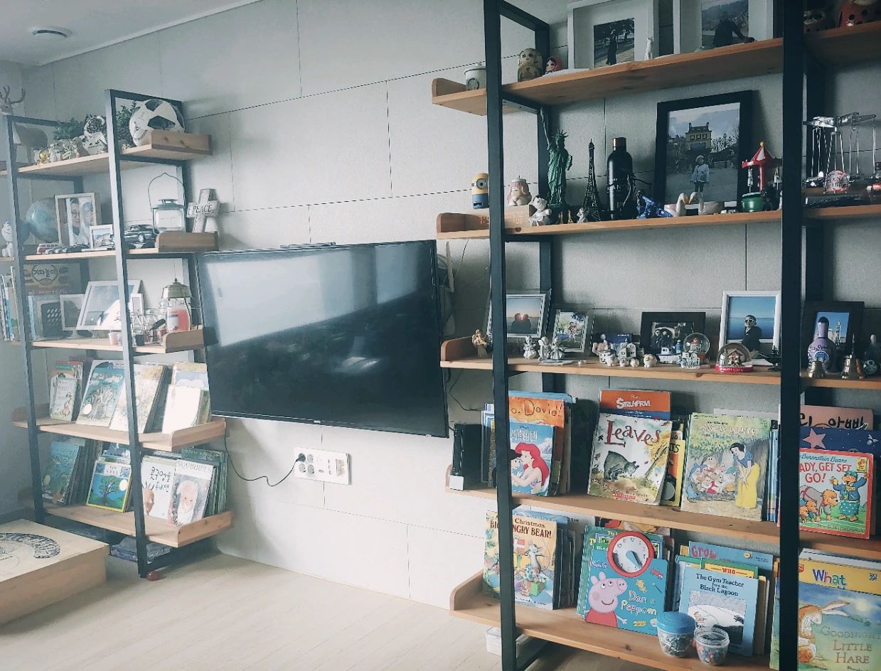 아이의 눈이 닿는 곳에는 꼭 책이 있다.책뿐 아니라 아이와 함께한 여행지에서의 추억이 담긴 소품들과 가족사진도 함께 진열되어있다.