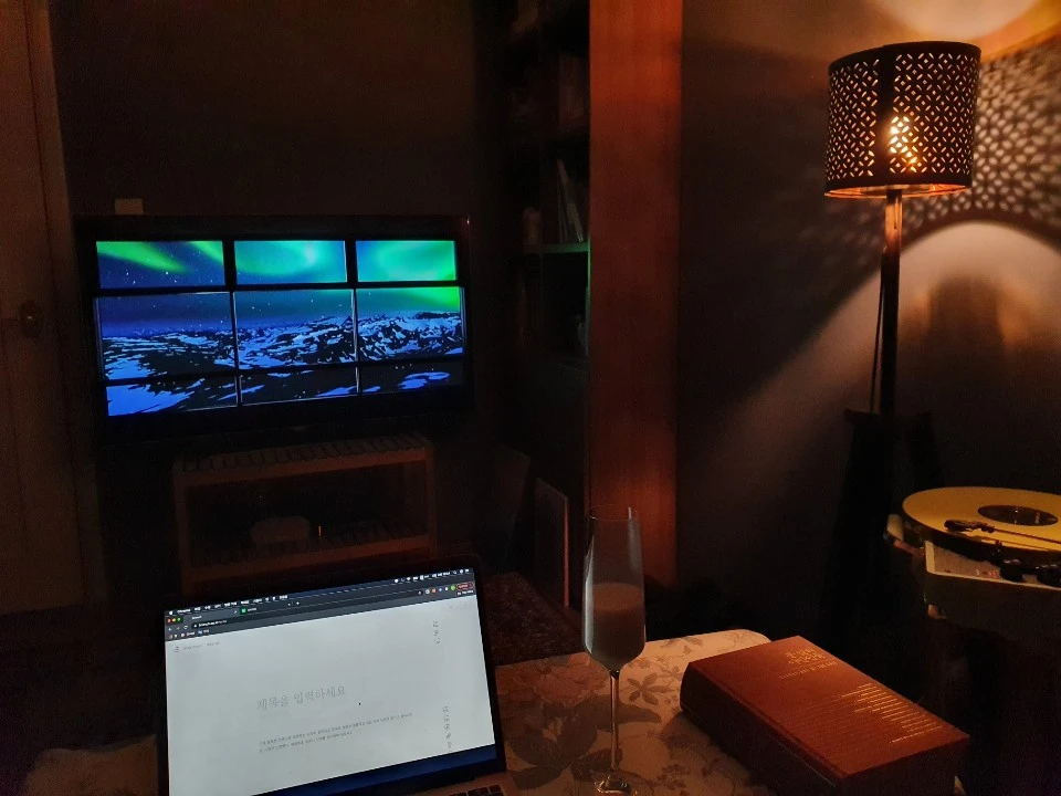 TV 방 에어컨을 엄청 엄청 세게 틀어서 오들오들 담요를 덮고 음소거로 눈 오는 핀란드 풍경을 보고 있다. 여기는 대한민국 서울시.. 방구석 아, 아니다 핀란드다 핀란드다. 음악은 LP플레이에서 흘러나오는 쳇 베이커 님 그리고 샴페인 잔의 막걸리 굉장히 부조화스럽고 특별하다.