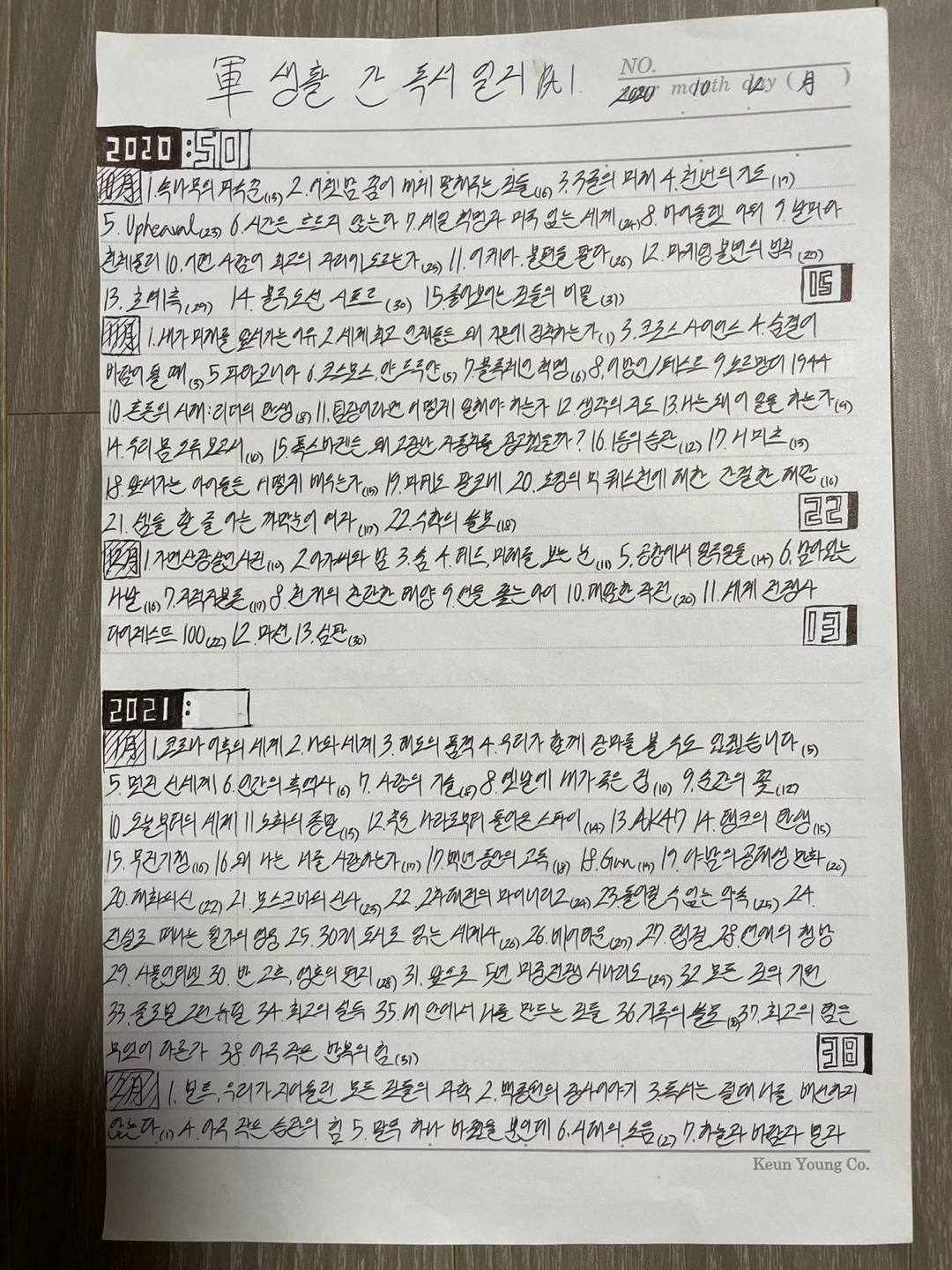 코로나 아래 복무 중이라는 현실을 잊기엔 책만 한 게 또 없었고, 쥐꼬리만 한 월급만 주는 국방부는 그래도 매년 독서지원금은 10만 원씩 챙겨줘, 읽는 만큼 책을 사다가는 살림이 거덜 나겠다는 집구석과 달리 책을 몇 권 살 수 있었다.