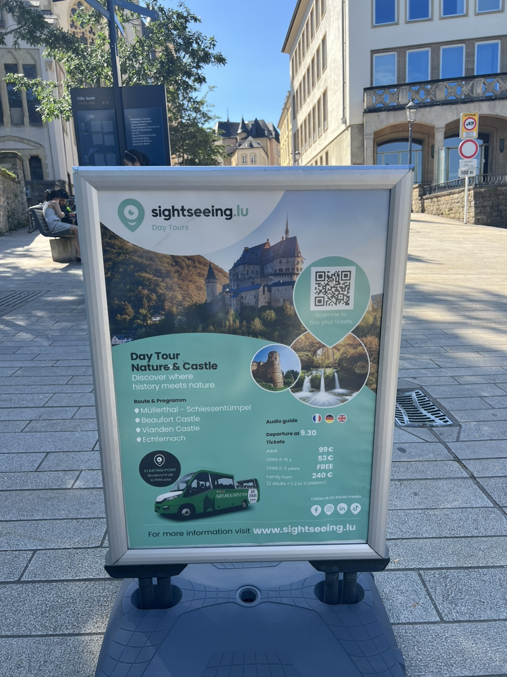 오가는 길에 마주한 투어 정보 간판. 99유로라니.. 처음엔 9.9유로를 잘못 읽었나 싶었지만 아니었고, 다시 한번 체감하게 되는 살인적인 룩셈부르크의 물가. 실제로 식당 간판 메뉴를 보더라도 주로 가격이 10유로 후반 20유로 초반 대에 형성돼 있다.