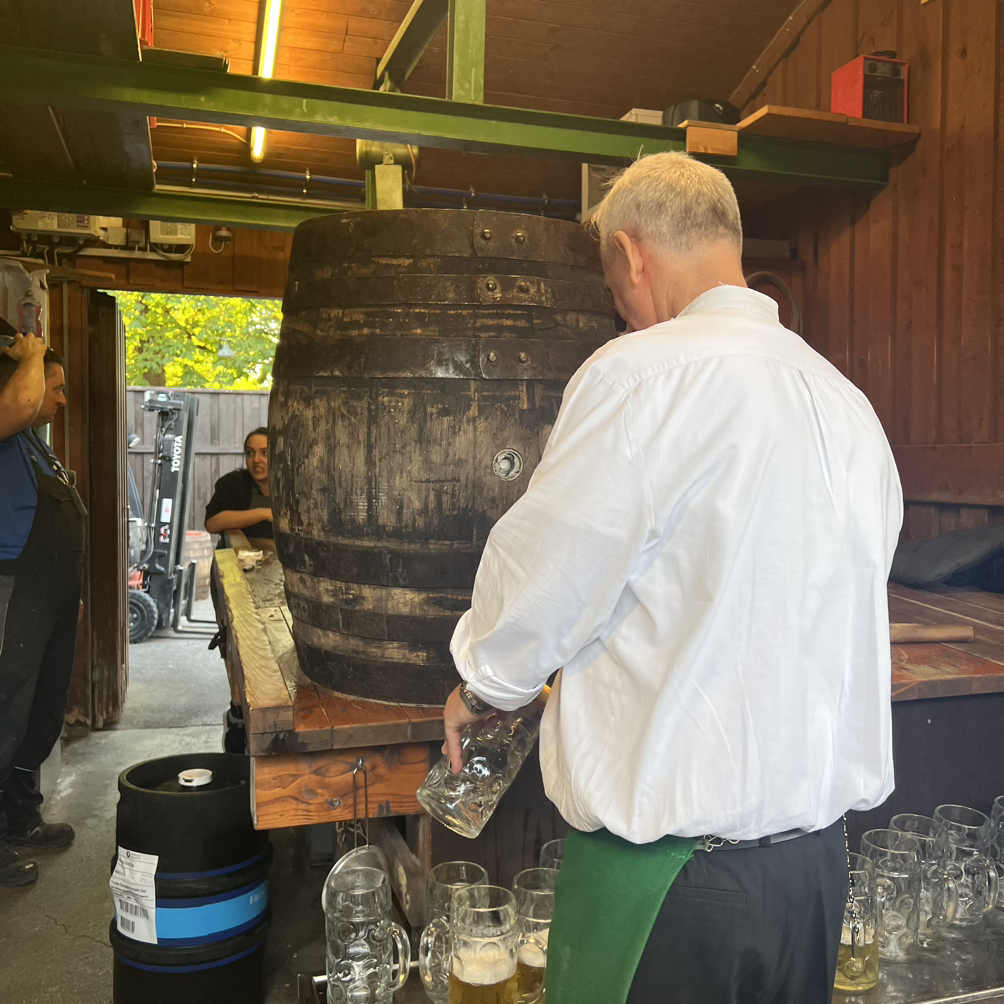 어느 비어가든의 셀프서비스 코너가 그렇듯, 잔을 기울여 오크통에서 바로 따로 준다.