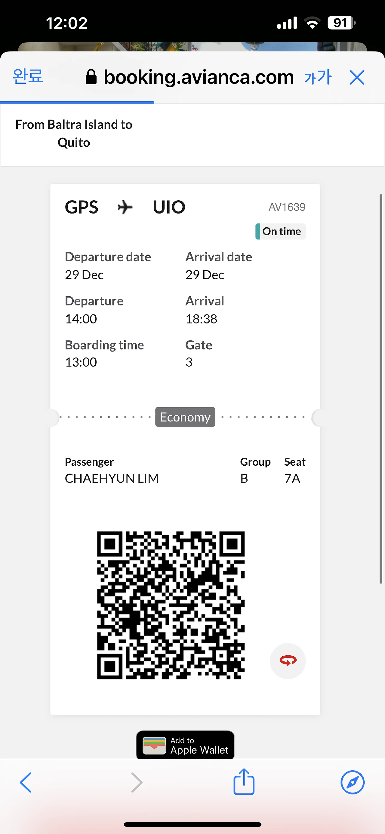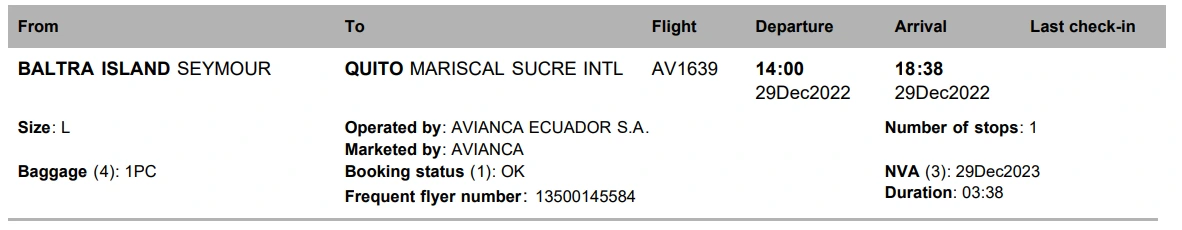 이러한 우려들에도 불구하고 갈라파고스행 노선을 운영하는 항공사는 아비앙카 항공과 LATAM 항공 두 곳뿐이었고, 결국 나는 울며 겨자 먹기로 20 달러 정도 더 저렴한 아비앙카 항공의 티켓을 끊었다.