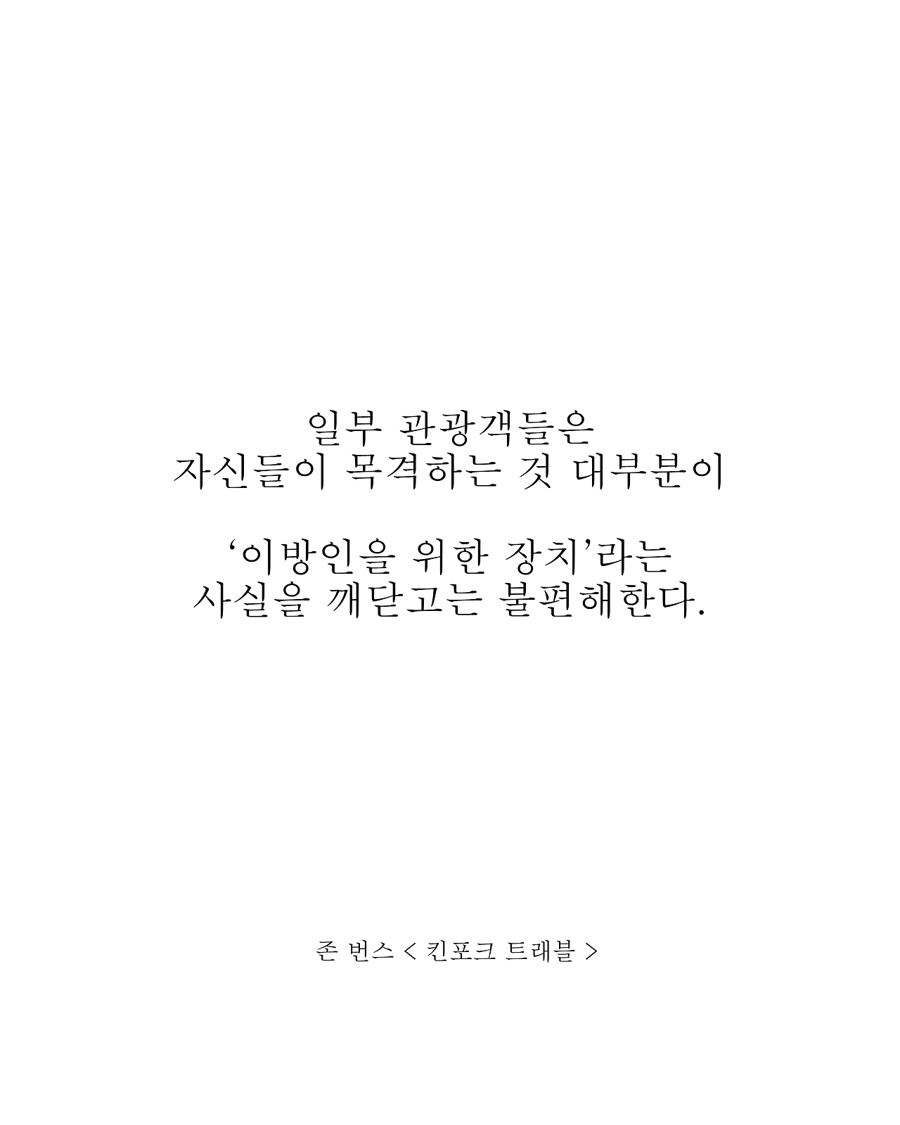 가끔은 우산 따위로 장식한 거리에 다다른다. 분명 아름답지만, 다른 도시들에도 허다하게 반복되는 장식임을 깨닫게 되면 감흥은 허망함에 자리를 내준다. 오버투어리즘과 기술의 발달로 사람들은 순수하게 찬탄하는 능력을 잊어가고, 감동의 역치 또한 낮아져만 간다.