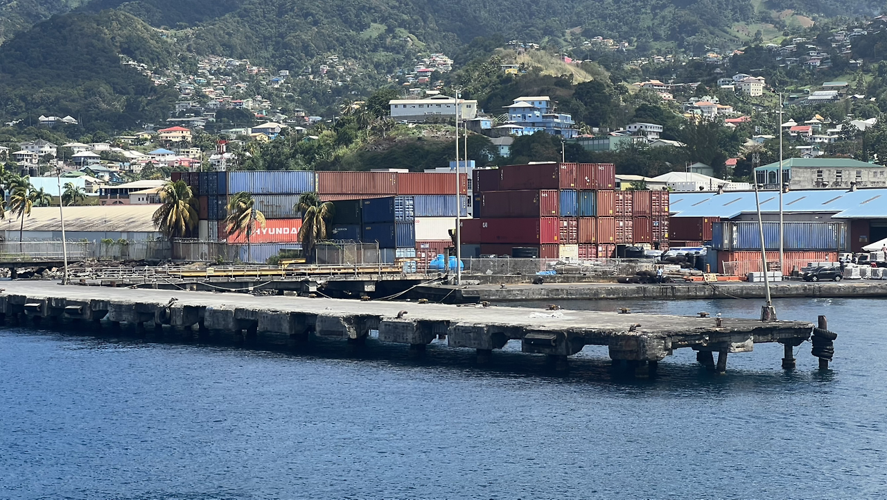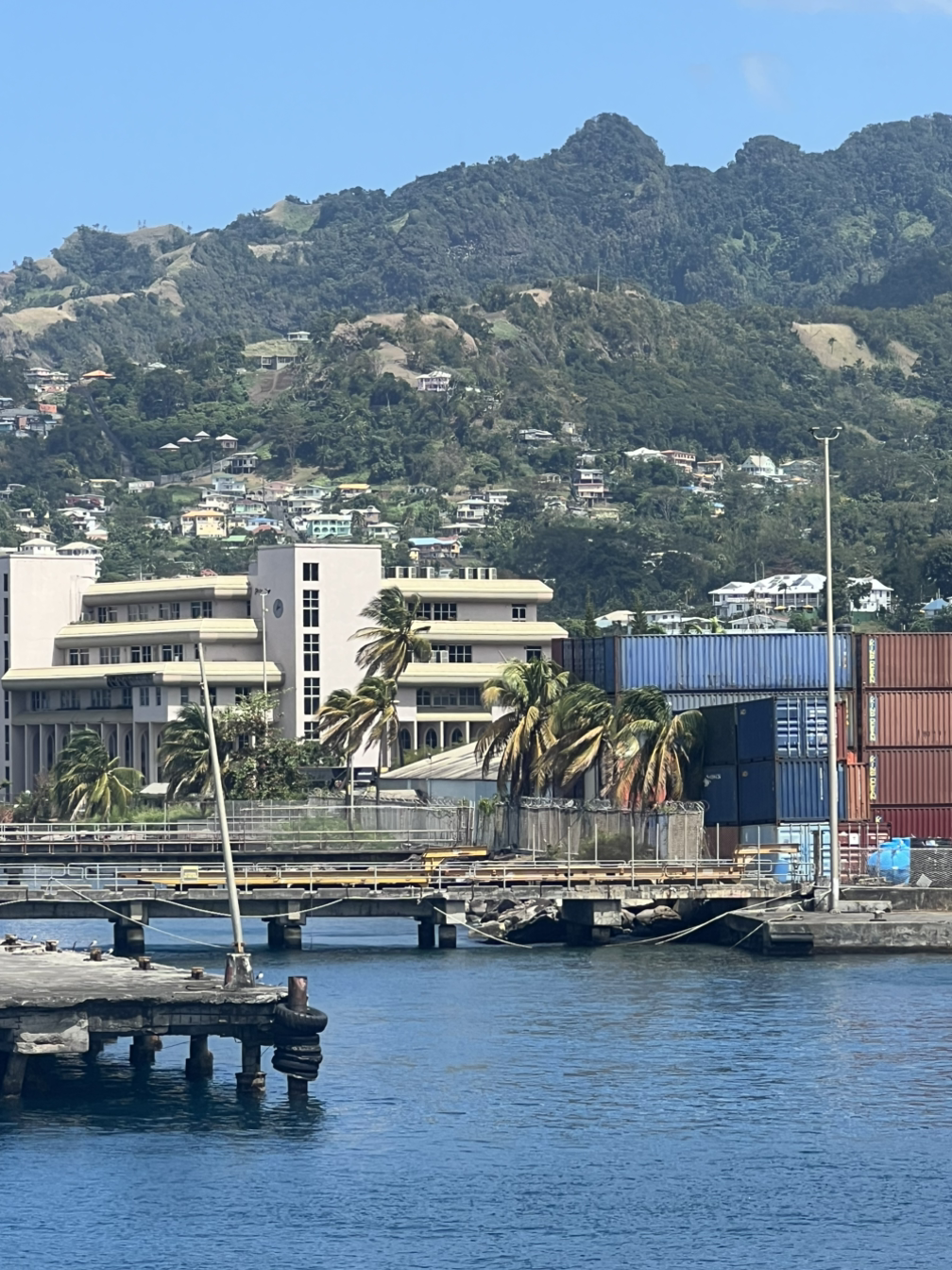 야자수와 컨테이너의 대비가 새롭다. 앞에 보이는 건 육지가 맞지만 또 다른 섬 속의 육지이다.