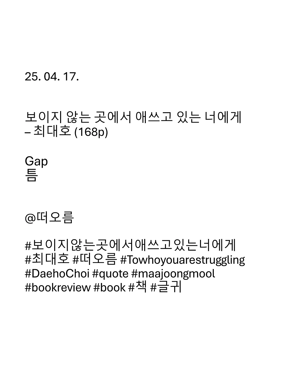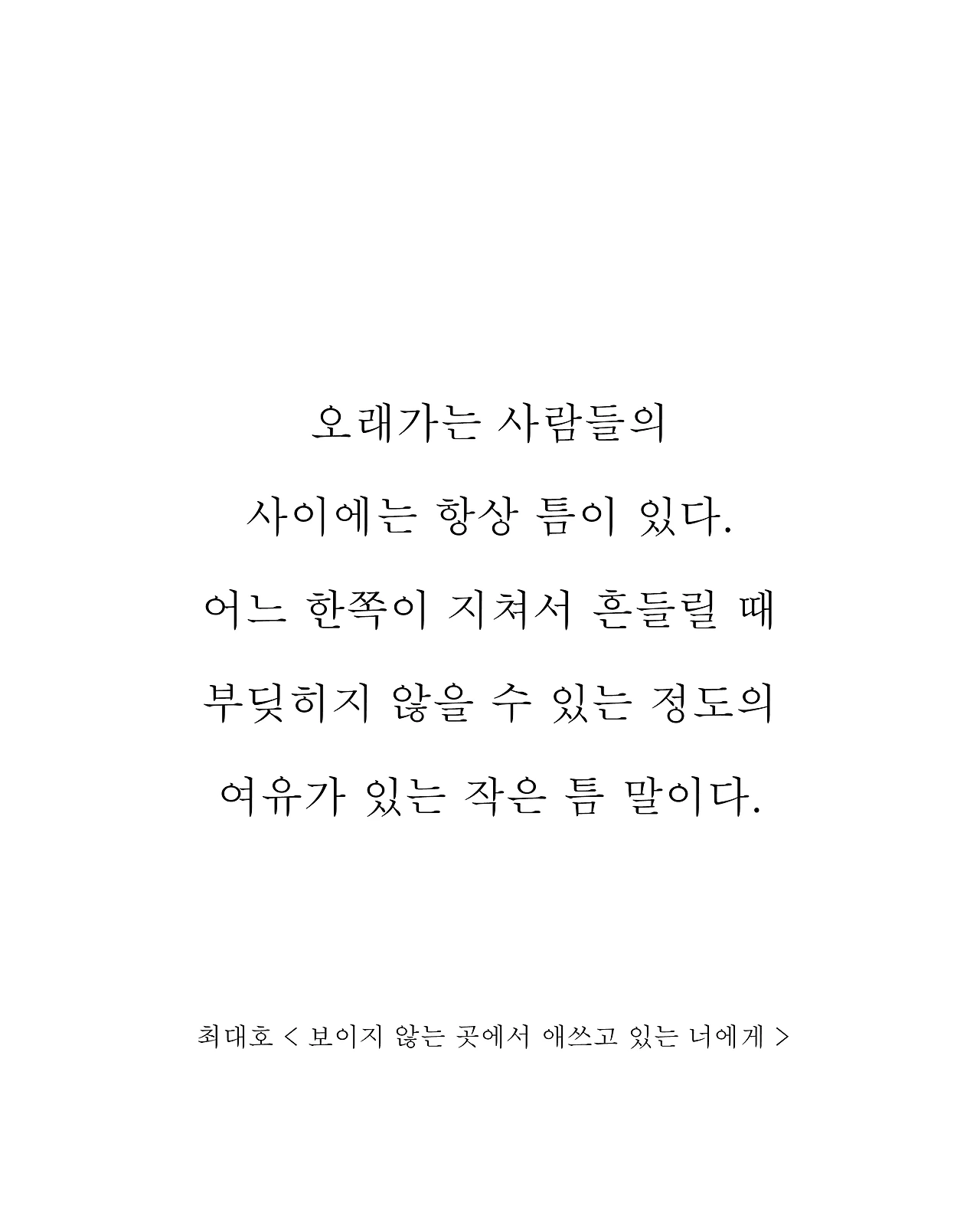 오랜만에 집에 돌아오면 다툼마저 반갑다. 아등바등 부대껴 살던 지난날의 정겨운 기억 때문일까. 이역만리 타향에서 살다 보면 아득해지는 고향 풍경. 부모님 거닐던 갈맷길의 파도, 주말마다 공 던지고 놀던 근린공원의 활기, 즐겨 찾던 낙지집의 매콤한 향이나 따뜻한 국숫집의 온기 등, 익숙했던 모든 것들과 조금씩 그러나 분명히 멀어진 지금. 오래가는 사이의 틈. 멀어진 물리적 거리만큼, 가까이 지내던 사람들과의 심적 거리는 되려 좁혀져, 더 자주 떠오르고 더 깊이 그리워한다. 거리를 이기는 그리움, 시간 위 추억의 설흔雪痕