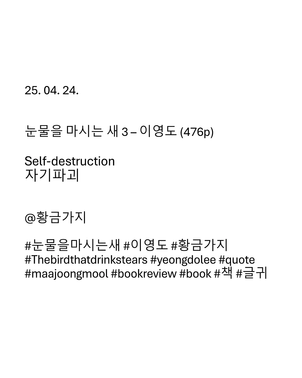 생명은 파괴를 일으켜 자신을 유지한다. 우주의 태동. 별의 탄생, 성운의 소멸. 씨앗의 발아, 나무의 고사. 뻐꾸기의 탁란. 꽃과 벌의 수분. 파괴와 유지. 발생과 환원. 기생과 공생. 별의 잔해가 거름이 되어 우주를 순환하듯, 돌고 도는 반합의 굴레 속 오롯이 영원한 변화