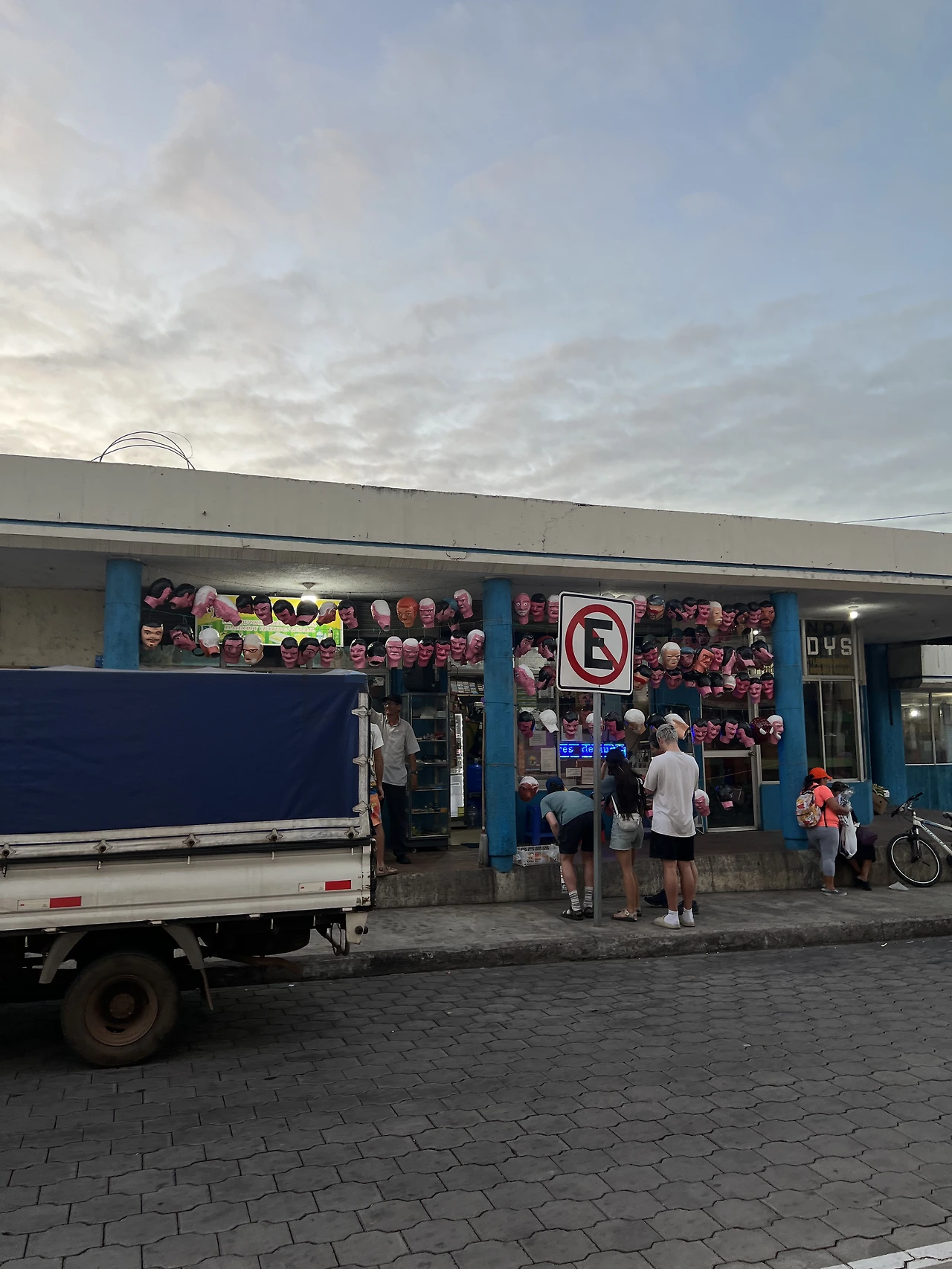 정체 모를 가면이 가득한 슈퍼 마켓 앞을 지나