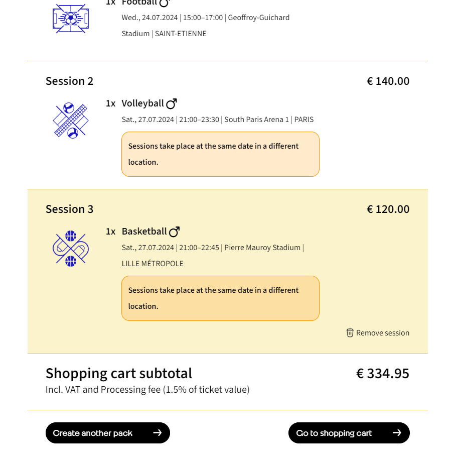 이번 파리 올림픽 티켓팅은 크게 1차, 2차로 나뉘는데, 1차의 경우 1, 2, 3 세션을 모두 지정해 구매하는 방식으로, 각 세션 별로 최대 6장, 총 18장을 구매할 수 있으며, 계정 당 최대 30장을 구매할 수 있다. 1개의 팩을 구성해 개당 3 경기를 담는 방식이다.