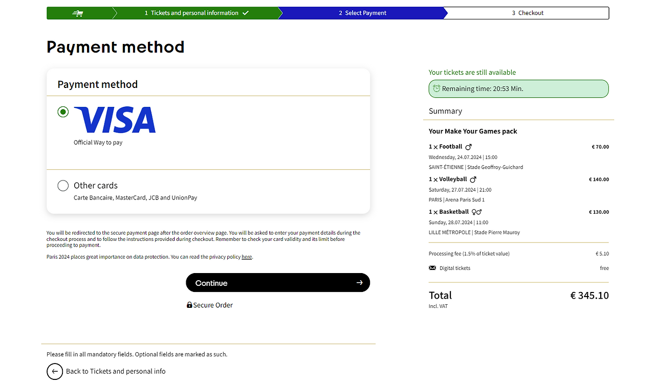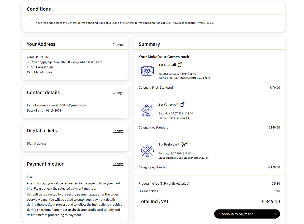카드 결제창이 뜨는데, 메인 스폰서가 VISA 카드이기에 VISA가 제일 크게 나오지만, Carte Bancaire, 마스터카드, JCB, 유니온페이로도 결제할 수 있었다. VISA 카드로 결제했다.