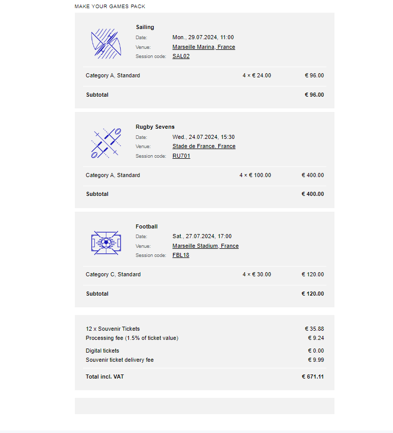 기념품 티켓도 선택할 수 있다. 개당 9유로. 지류 티켓을 제공하지 않기에 추억으로 남길 만한 기념품이 필요하다면 9유로(한화 13,000원)를 주고 구매가 가능하다. 다만 배송은 올림픽 이후 진행된다는 점!