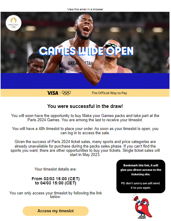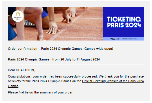 그렇게 어제, 학교 과제 알림으로 덕지덕지 도배된 메일함을 정리하기 위해 관성적으로 앱을 열던 찰나, Paris 2024 Tickets로부터 메일이 왔음을 확인했다. 부푼 마음을 가득 안고 메일을 여니 추첨에 당첨됐다는 내용의 이메일이 와있었다.