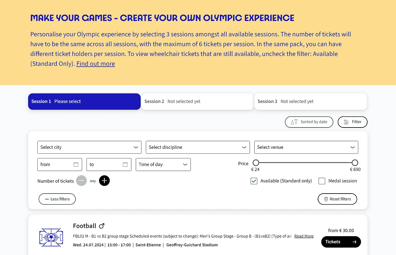 아래 링크를 타고 들어가, 친구들과 1에서 3 지망 경기들을 정했고, 파리 여행이 처음일 친구들을 위해 되도록이면 파리에서 열리는 경기를 관람하는 것으로 방향성을 정했다.