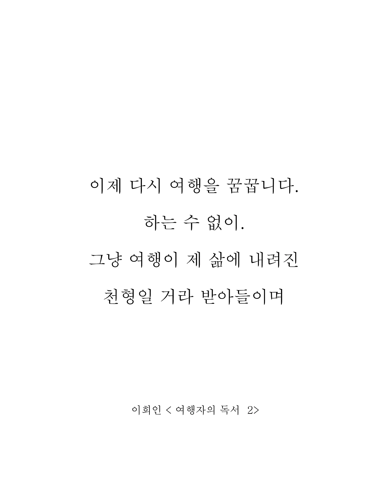 돌이켜 보면, 'Later Problem!'이라며 문제를 여유롭게 웃어넘기는 습관이 내게 스며든 것도 그때부터였고, 역마살 낀 삶을 달가운 천형과 함께 살아가리라 어렴풋이 짐작한 것도 그때부터였다. 결국 나는 어딘가로 또 떠나고 방랑하며, 쉬이 만족지 못해 한 곳에 정주치 못하리라는 예감, 아니 운명에 가까운 확신.