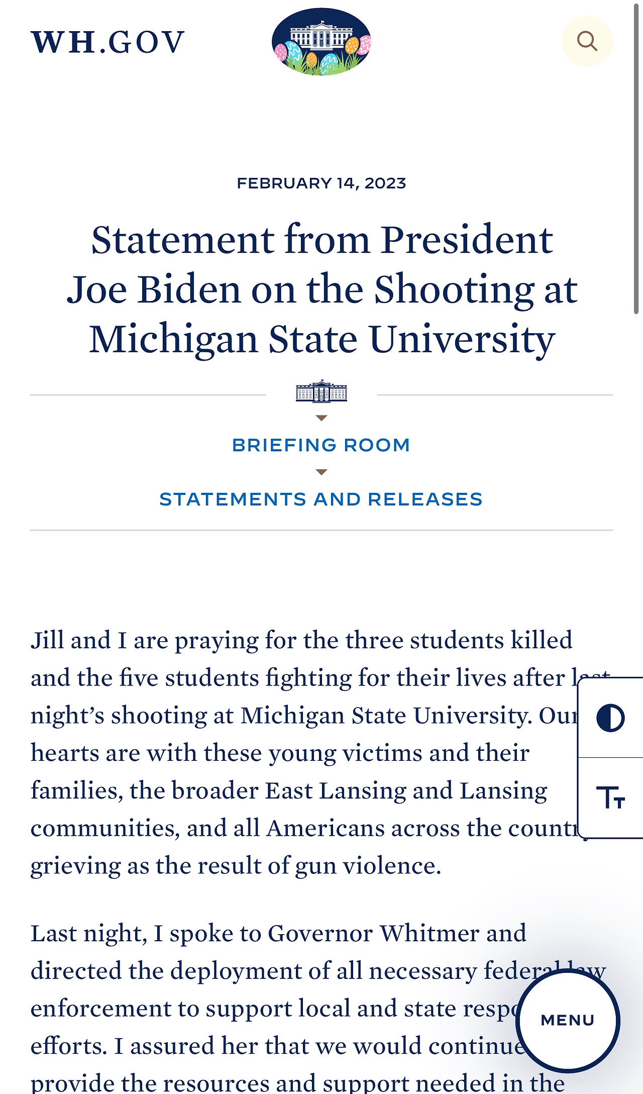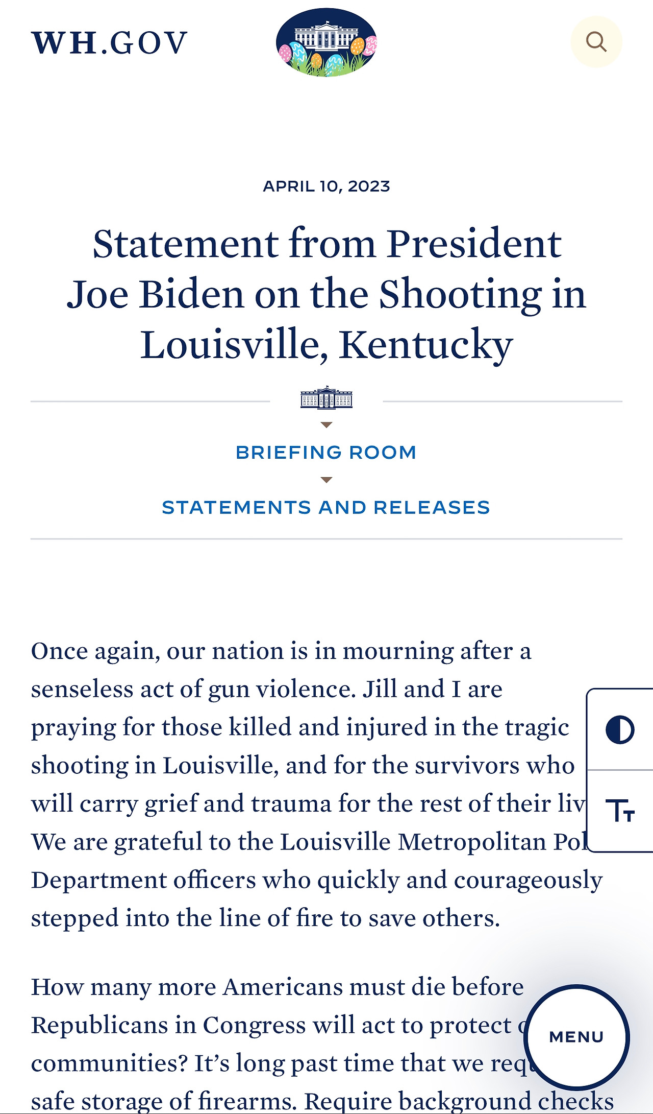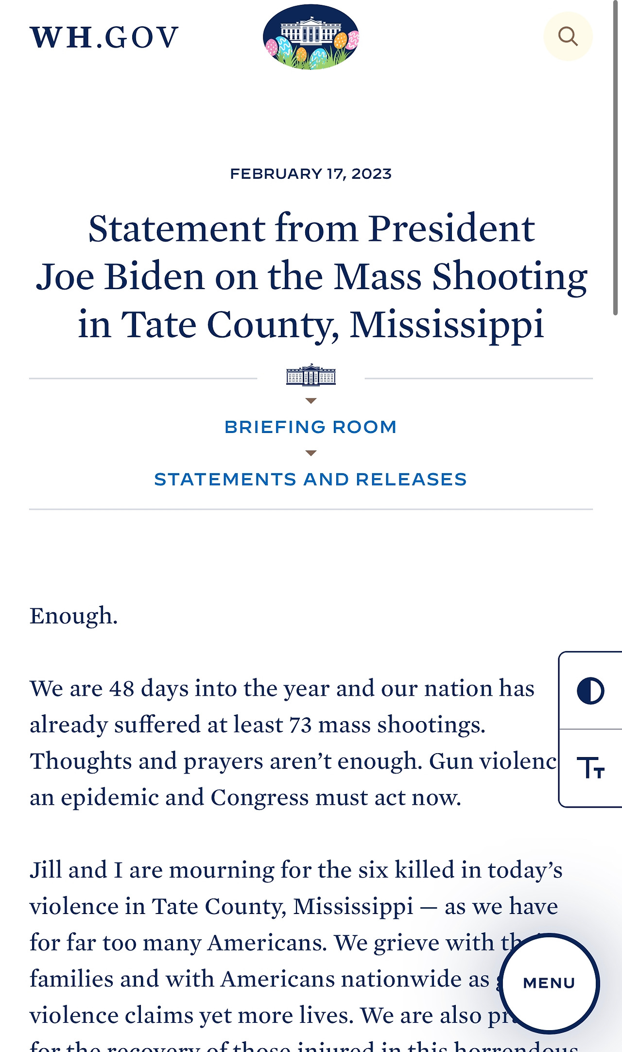 백악관에도 주기적으로 사망자들에 대한 애도와 규제를 촉구하는 성명문이 게재될 정도이니, 현재 미국의 총기 문제는 이미 손댈 수 없이 커져버렸다고 할 수 있다.