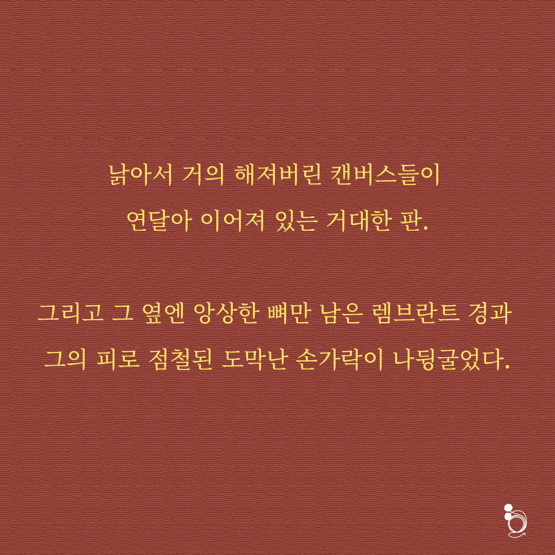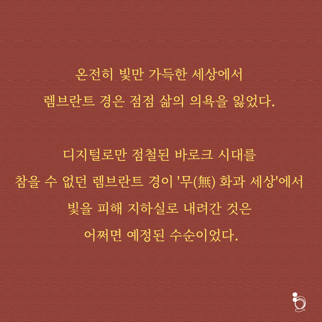 온전히 빛만 가득한 세상에서 렘브란트 경은 삶의 의욕을 잃었다. 디지털로만 점철된 바로크 시대를 참을 수 없던 렘브란트 경이 '무(無) 화과 세상'에서 빛을 피해 지하실로 내려간 것은 어쩌면 예정된 수순이었다. 그렇다. 그는 빛을 피해 지하로 숨어들었다. 어둠 속에서 남은 생을 지내겠다고 선언한 것이다. 지하실엔 그의 아버지의 아버지의 아버지의 아버지....... 대부터 전해져 왔다는 그림 몇 점이 있을 뿐이었다. 그마저도 모두 빛바랜 그림이었다.