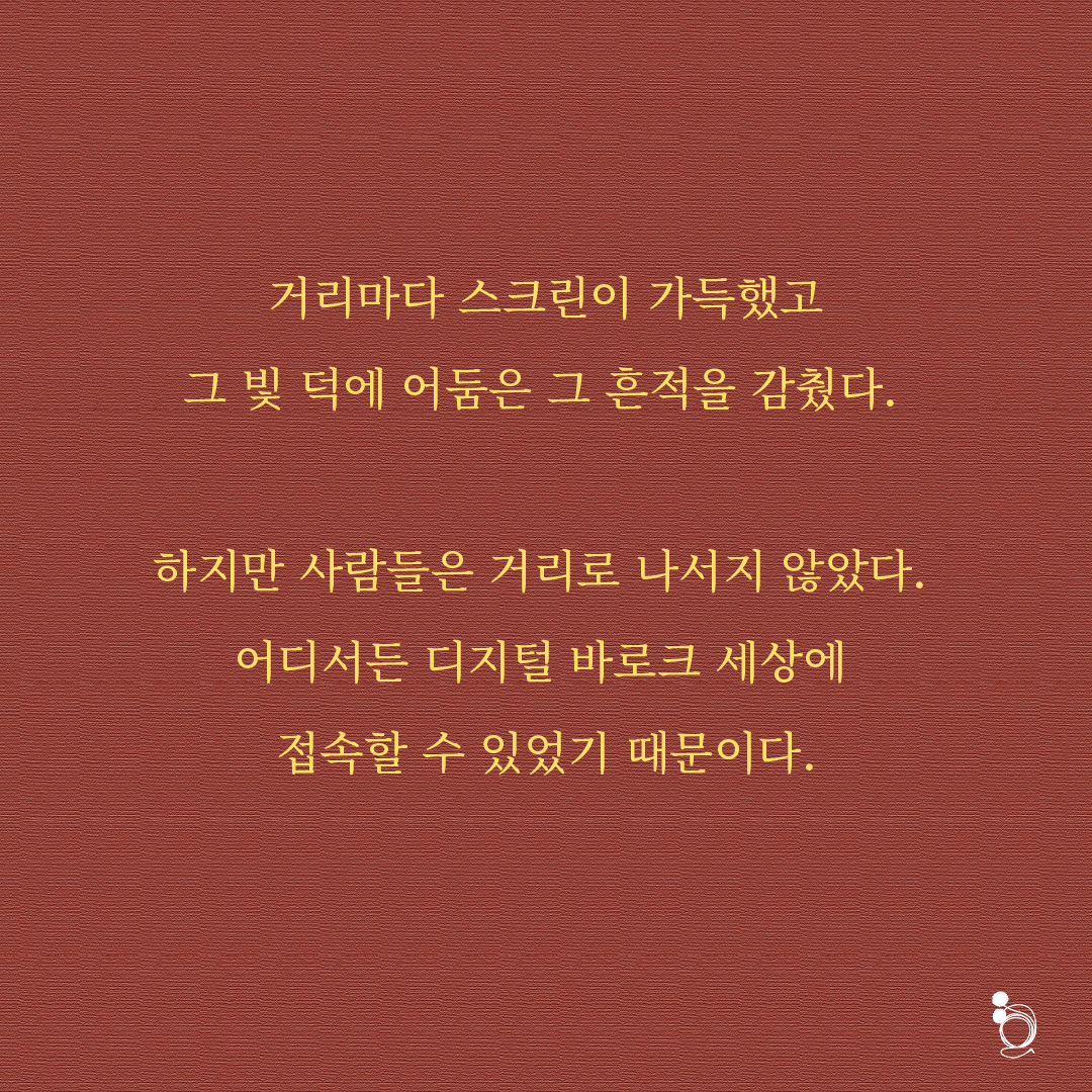 VR 고글과 무선이어폰, 음성인식 AI 비서는 사람들의 필수품이었다. 거리마다 스크린이 가득했고 그 빛 덕에 어둠은 흔적을 감췄다. 하지만 사람들은 거리로 나서지 않았다. 어디서든 디지털 바로크 세상에 접속할 수 있었기 때문이다. 디지털 바로크 세상을 통해서라면 거리에 나서지 않고도 사람들을 만났고, 원하는 일을 처리할 수 있었다. 그 속에서 렘브란트 경은 누군가라도 그림을 그리는 이가 있기를 바랐다. 종이 위에 그려진 그림이 있다면 자신이 가지고 있는 전 재산을 내걸고라도 사들일 생각이었다.