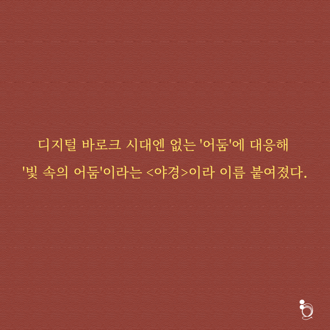 그렇게 렘브란트 경의 지하실에 남은 그림은 빛으로 점철된 세상에서 스스로 어둠 속으로 들어간 렘브란트 경의 모습을 빗대 디지털 바로크 시대엔 없는 '빛 속의 어둠'이라는 <야경>이라 이름 붙여졌다. 데이터 센터가 건립될 예정이었던 렘브란트 경의 집은 모든 디지털 기기를 벗고서야 입장해서 관람할 수 있는 전시관이 되었다. 그 덕에 사람들은 메말랐던 감정을 그 그림을 보며 풍부하게 채울 수 있었다.