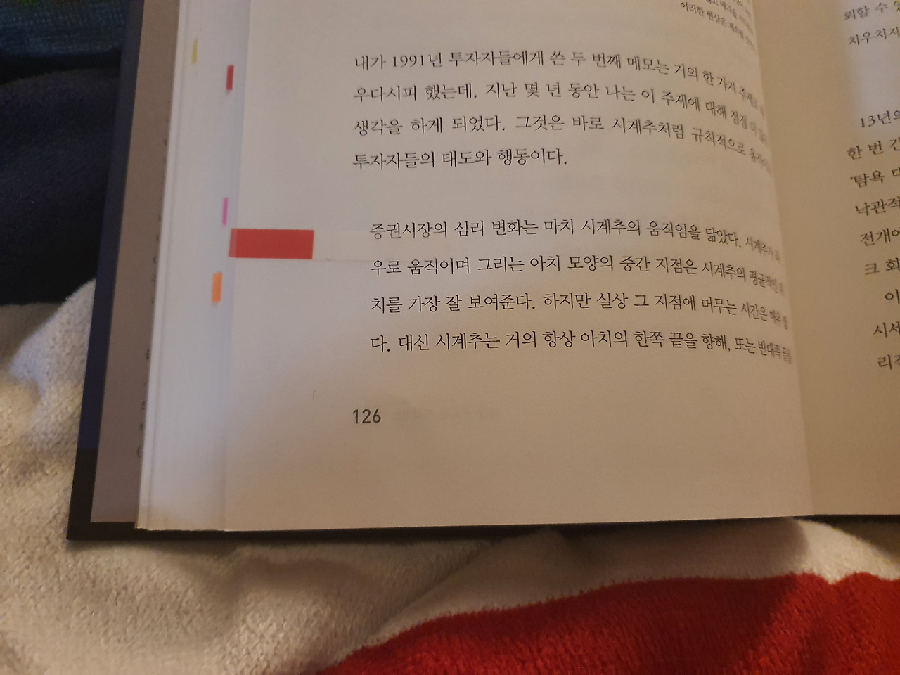 증권시장의 심리 변화는 마치 시계추의 움직임을 닮았다. 시계추가 좌우로 움직이며 그리는 아치 모양의 중간 지점은 시계추의 평균적인 위치를 가장 잘 보여준다. 하지만 실상 그 지점에 머무는 시간은 매우 짧다. 대신 시계추는 거의 항상 아치의 한쪽 끝을 향해, 또는 반대쪽 끝을 향해 움직이고 있다. 그러나 시계추가 어느 한끝에 다다를 때마다 추는 곧바로 다시 중심을 향해 움직인다. 사실상 한쪽 끝을 향해 가는 움직임 자체가 역방향으로 되돌아가기 위한 동력을 제공한다. 이렇듯 투자시장은 다음과 같은 시계추의 움직임을 따른다. • 호황과 침체 사이 • 긍정적 사건에 반색하는 것과 부정적 사건에 집착하는 것 사이 • 그러므로 고평과와 저평가 사이 위와 같이 양극단을 오가는 규칙적인 움직임은 투자 세계에서 가장 신뢰할 수 있는 특징 중 하나이다. 그리고 투자자 심리는 어느 한쪽으로 치우치지 않은 '중도'보다는 양극단에서 보내는 시간이 훨씬 많다. ('1분기 실적', 1991년 4월 11일 메모) 《투자에 대한 생각》, 하워드 막스 지음 - 126p <9. 투자시장의 특성을 이해하라> 중