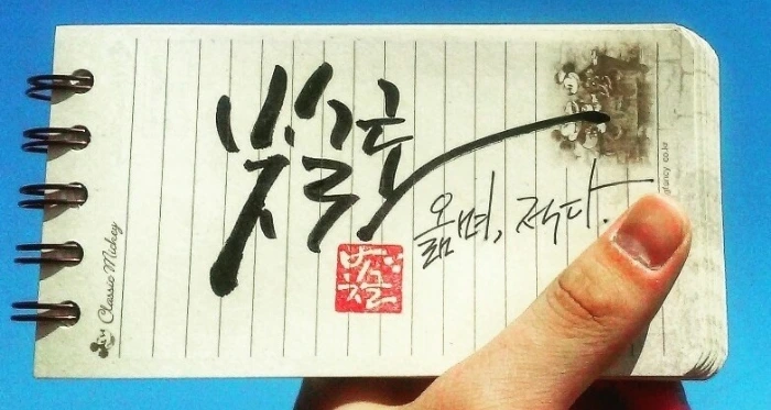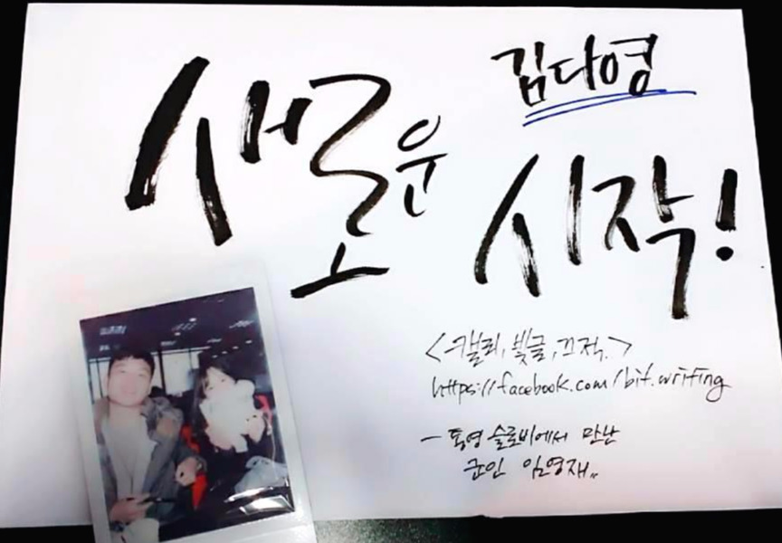 그리고, 나의 가장 큰 목적지는 거제 바람의 언덕이었기에, 바람의 언덕으로 향하려 통영 시외버스터미널로 다시 걸음을 옮긴다. 그리고 게스트하우스에서 잠깐 이야기를 나눴던 누님들을 다시 만난다. 목적지는 달랐지만 양쪽 모두 버스 시간까지 시간이 떠서 같이 시간을 보낸다. 그리고 그때 나는 일부러 챙겨갔던 캘리그래피 도구를 꺼내서 글귀를 하나씩 선물한다.