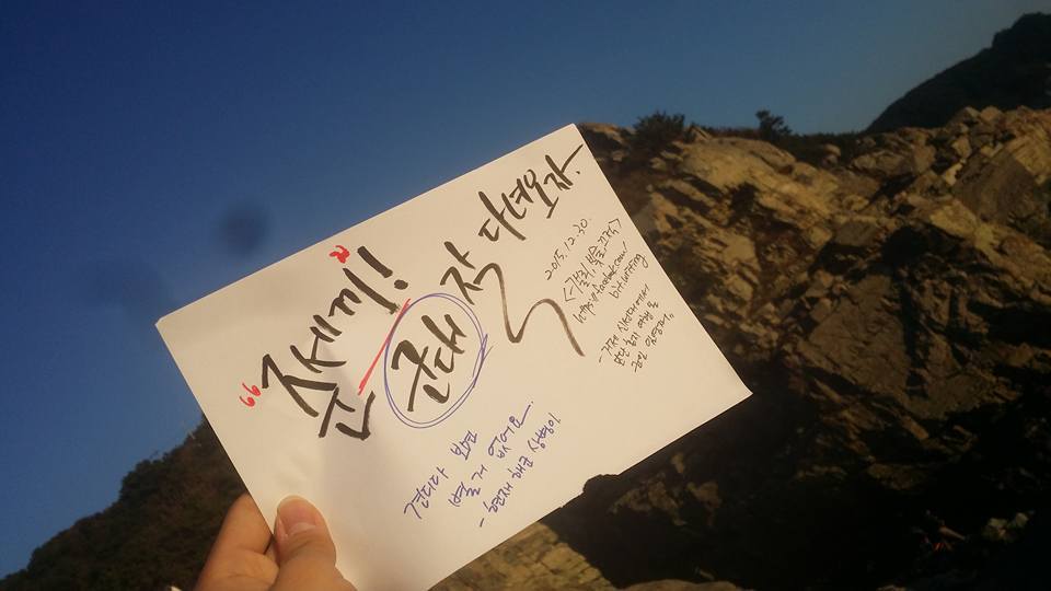 대게 주위 사람들에게 사진을 부탁하면 대부분이 기대 이하의 사진이 나오기 마련이었다. 그러다 우연히 혼자 떠나온, 그리고 혼자 떠나온 남자에게서 사진 부탁을 받은 그 남자는, 괜찮게도 사진을 찍어주었다. 그는 나보다 한 살 어린 95년생이었고, 10일 뒤면 군대에 입대를 한다고 했다. 나는 군인이었고, 군대 입대를 한다고 하니 뭔가 애틋하게 느껴졌다. 그래서 그나마 그 자리에서 내가 할 수 있었던, 손글씨를 하나 선물해주었다. 그러고 보니 이때는 해가 질까, 에 더 가까운 시간이었나 보다.
