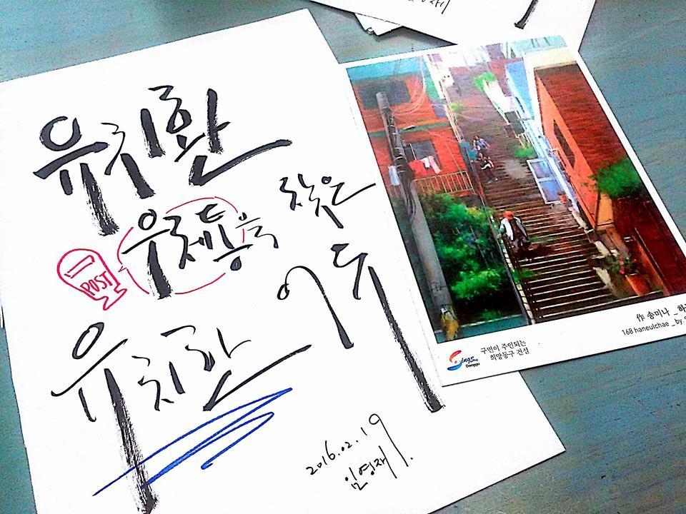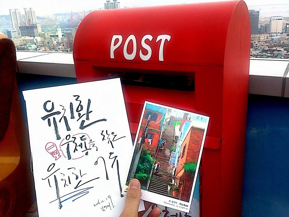 그렇게 이읃고 도착한 <유치환 우체통> 생각보다 너무 덩그라니 있었다. 하지만 내가 이 곳을 찾은 이유는 유치하게도 엽서 한 장을 붙이기 위해서였기 때문에 그런 것쯤은 아무 상관 없었다. 우체통 아래층에 위치한 시인의 방에서 엽서를 한 장 얻어서 1년 뒤 나에게 보내는 엽서를 썼다. 이 엽서를 쓰기 위해서 발걸음을 옮긴 것이었지만 막상 엽서를 쓰고자 펜을 들었을 때는 그다지 쓸 말이 없었다. 나는 정말로, 엽서를 한 장 1년 뒤의 나에게 부치기 위해 이 곳에 온 것이었을까. 어쨌든 큰 의미없이, 유치하게도 이 곳에 왔다.